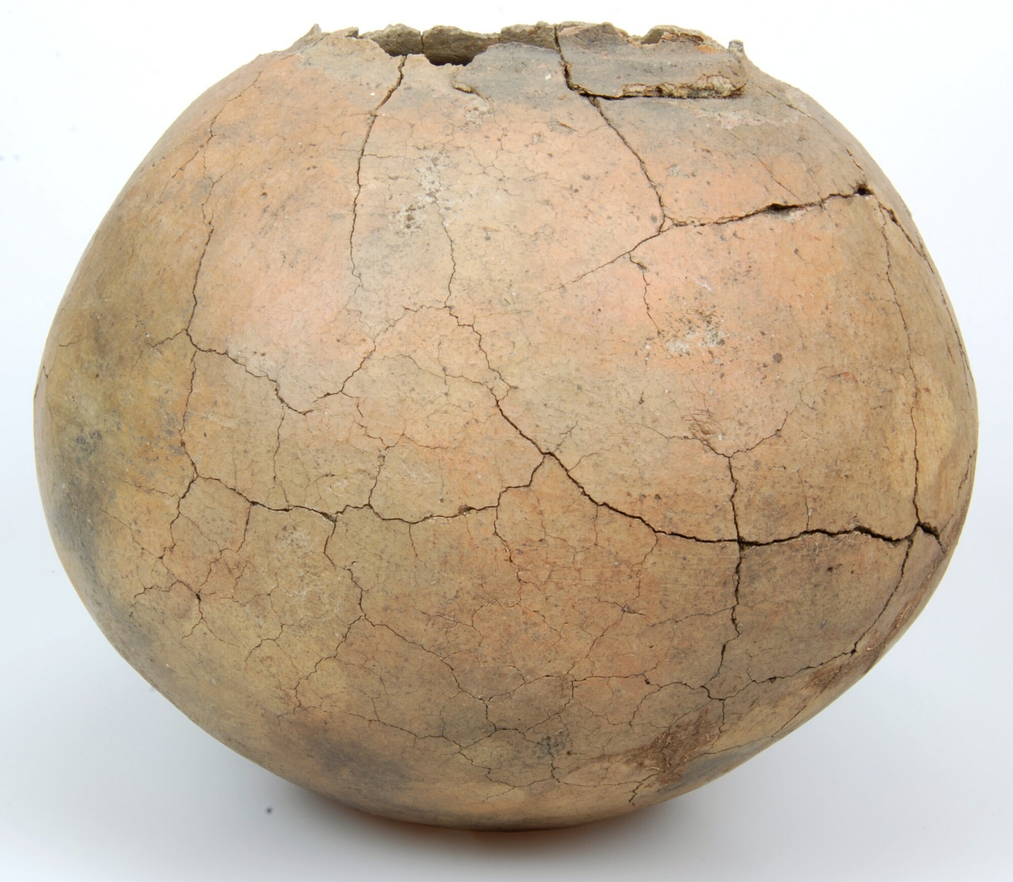 Urn; handgevormd aardewerk; 3-ledige hoge vorm; trechterhals en bolle buik; standvlak; kwartsgruis magering