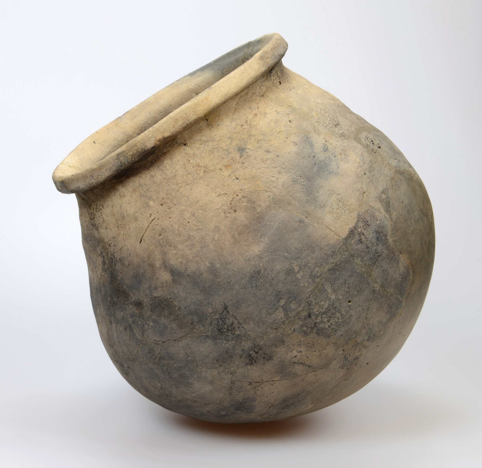 Kogelpot; kp-kog-7; kogelpot met zware kraagrand; kogelpotaardewerk met zandmagering; bodem beroet; herkomst: West- of Noord-Nederland