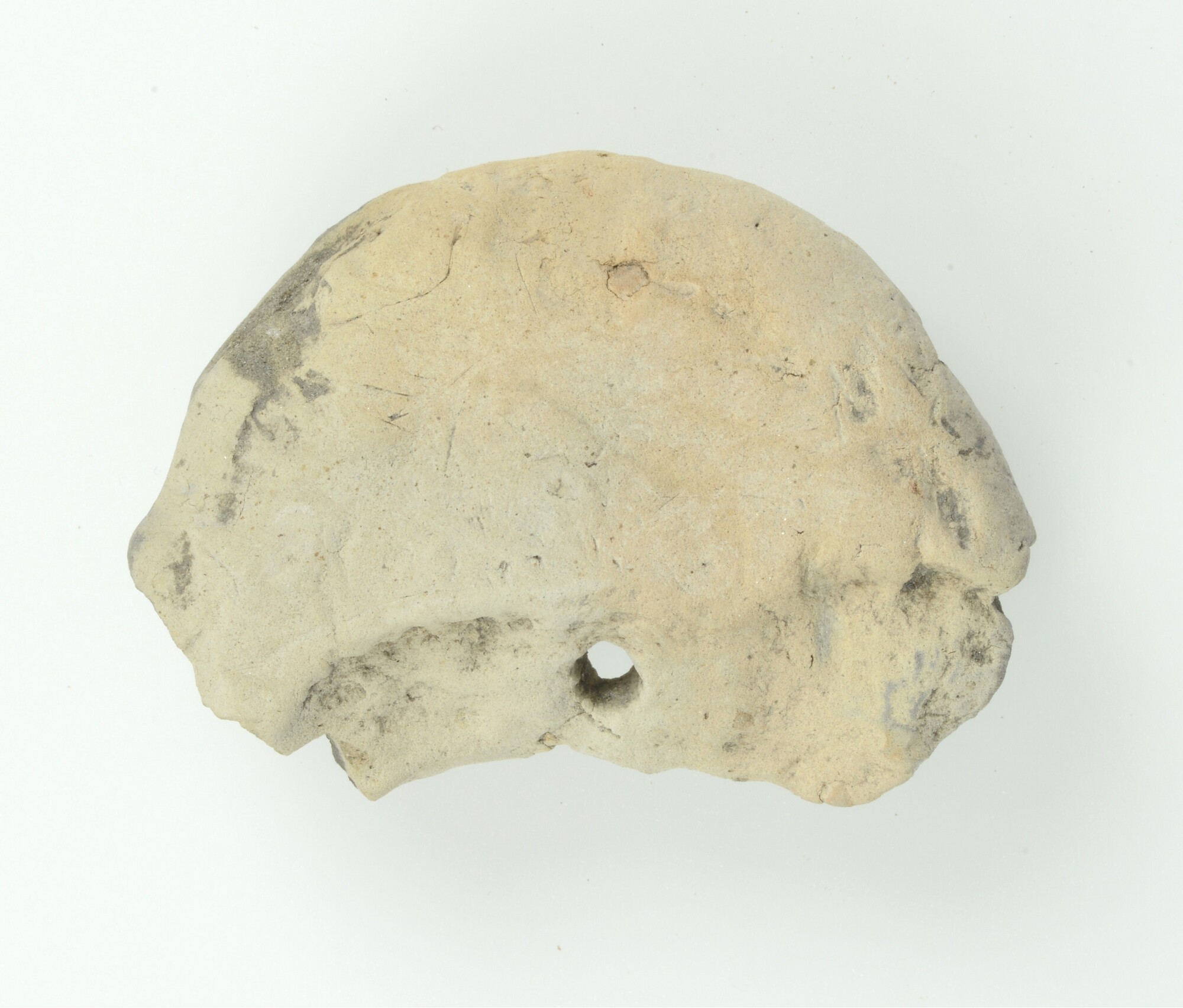 Spinsteen; Hoogkarspel-Jong aardewerk; platte spinsteen met schuine doorboring (diameter 3 mm); zandgemagerd