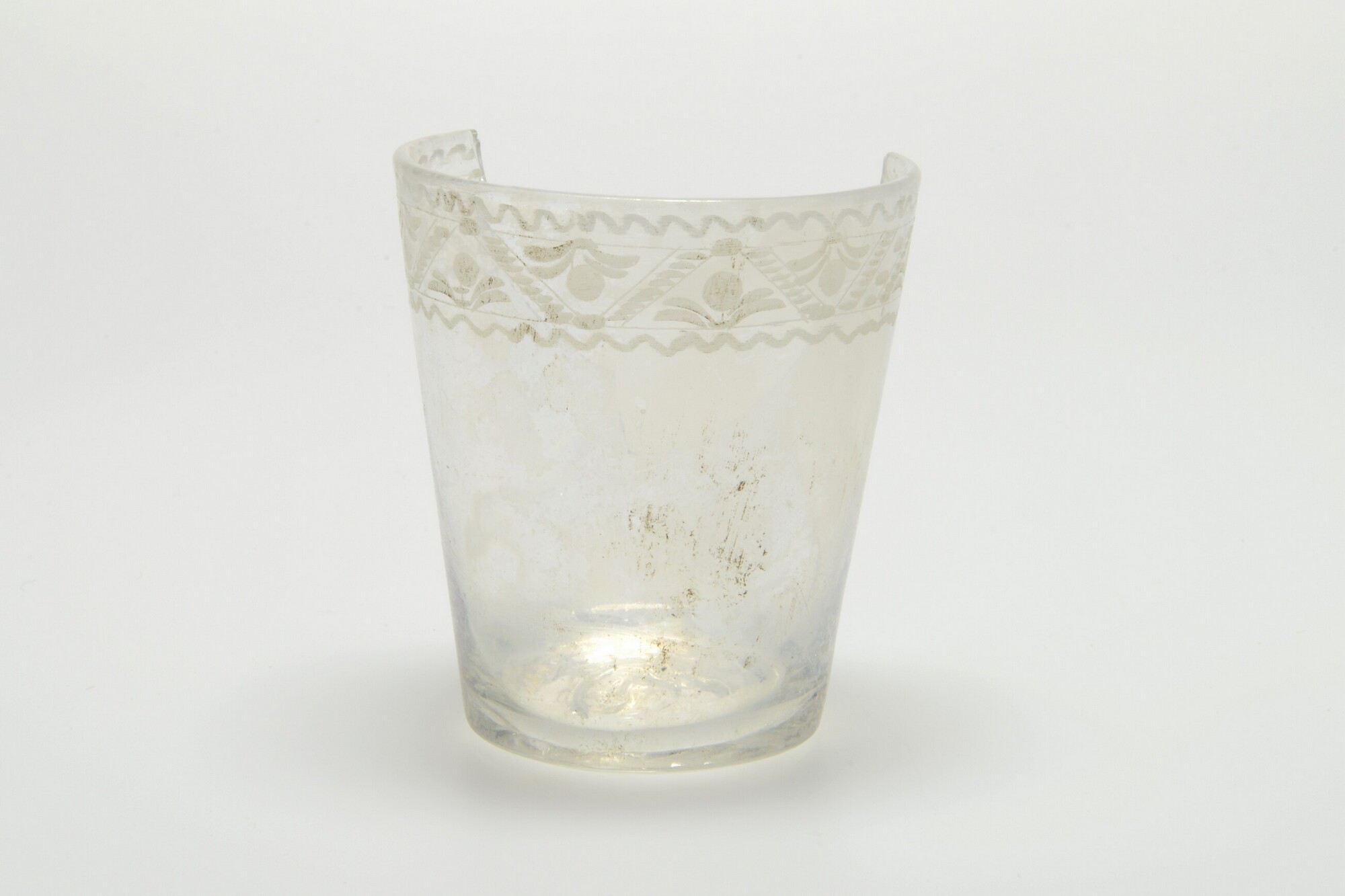 Beker; gl-bek-6a; dikwandige conische beker, verdikte bodem, standvlak met pontilmerk; kleurloos krijtglas; radgravure langs rand: zigzaglijn met daartussen florale motieven tussen twee slingerlijnen; herkomst: Bohemen of Oost-Duitsland
