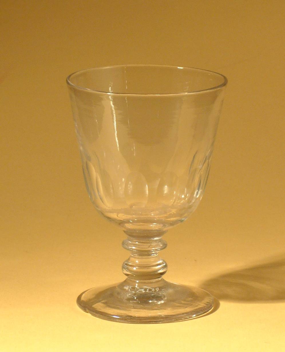Kelkglas met conische kelk, waarvan onderste gedeelte in 12 facetten in geslpn