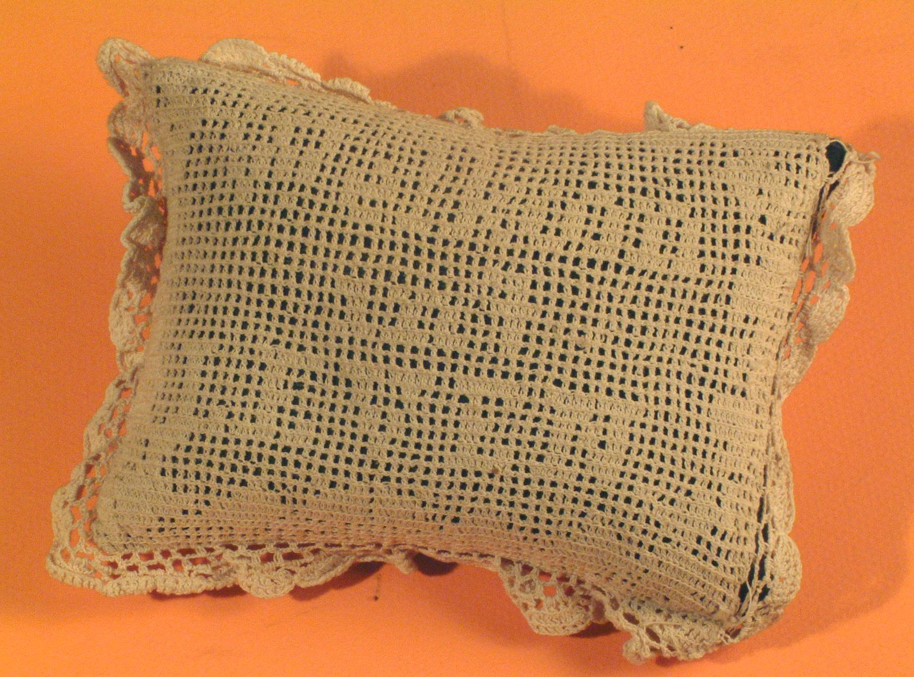 Blauw gestreept speldenkussen in wit gehaakt hoesje
