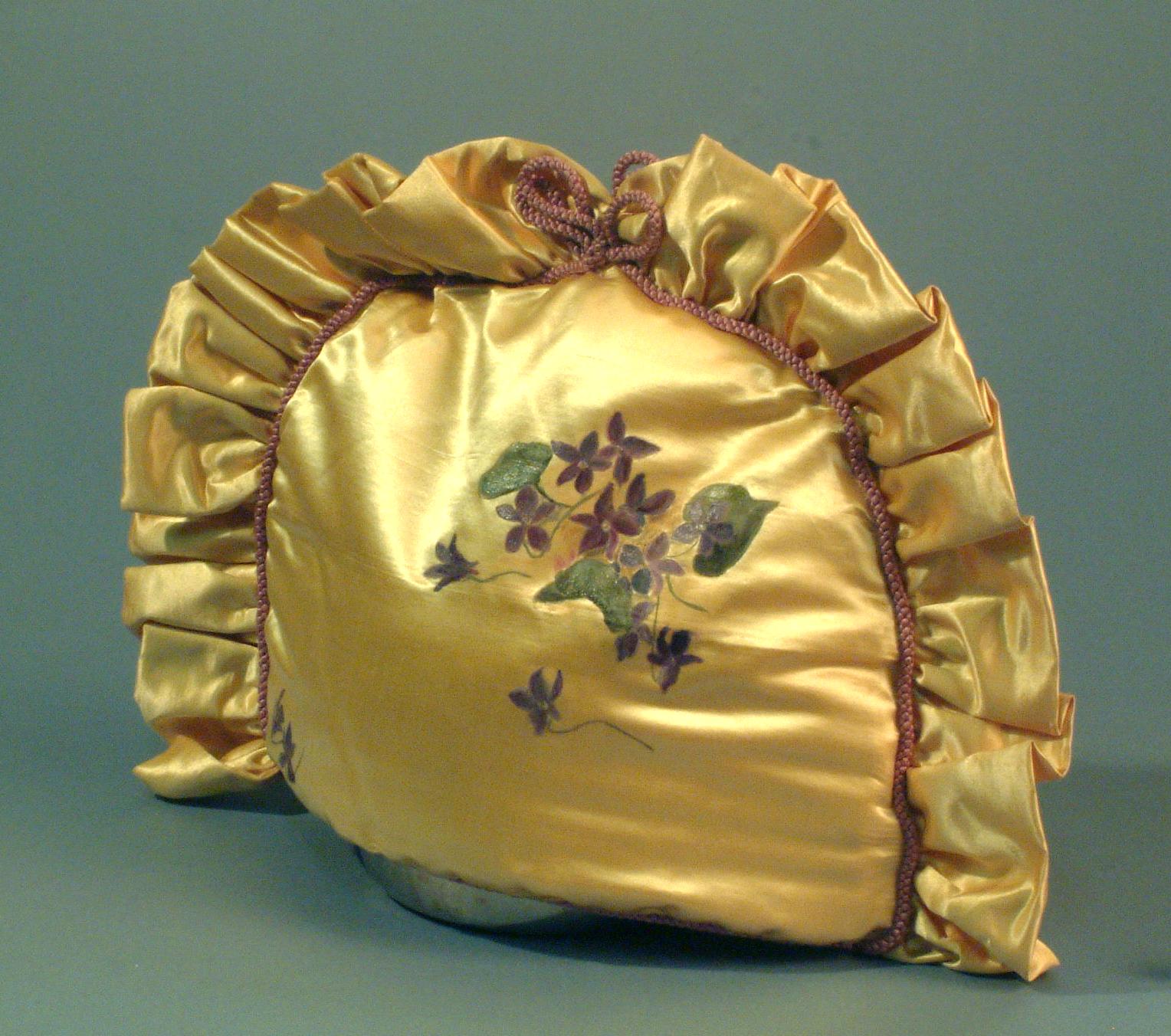 Geel satijnen theemuts met paarse bloemen