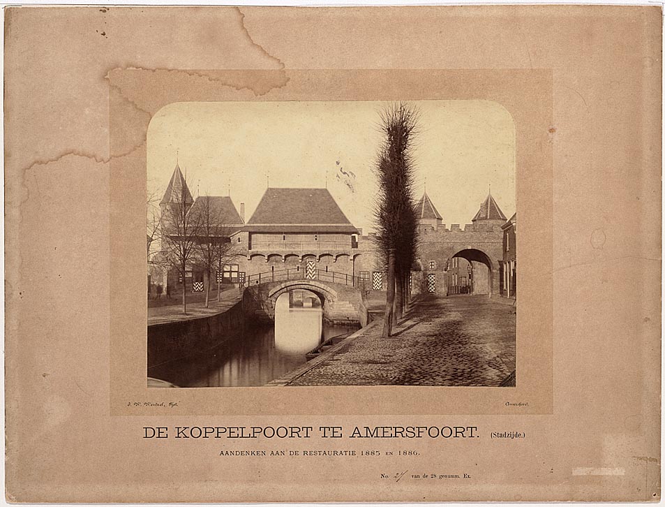 De Koppelpoort te Amersfoort (stadzijde); aandenken aan de restauratie 1885 en 1886