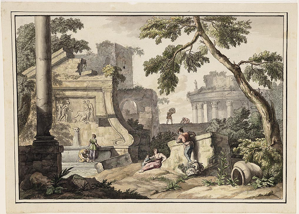 Naar: Landschap met ruines en watterbassin van Marco Ricci, 1730.