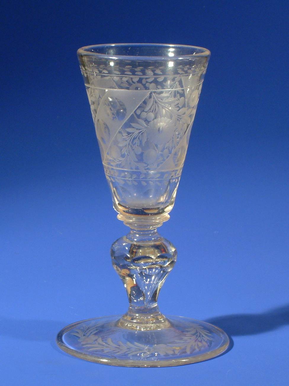 kelkglas gegraveerd met een brede band, waarin bloemen in schuine banen