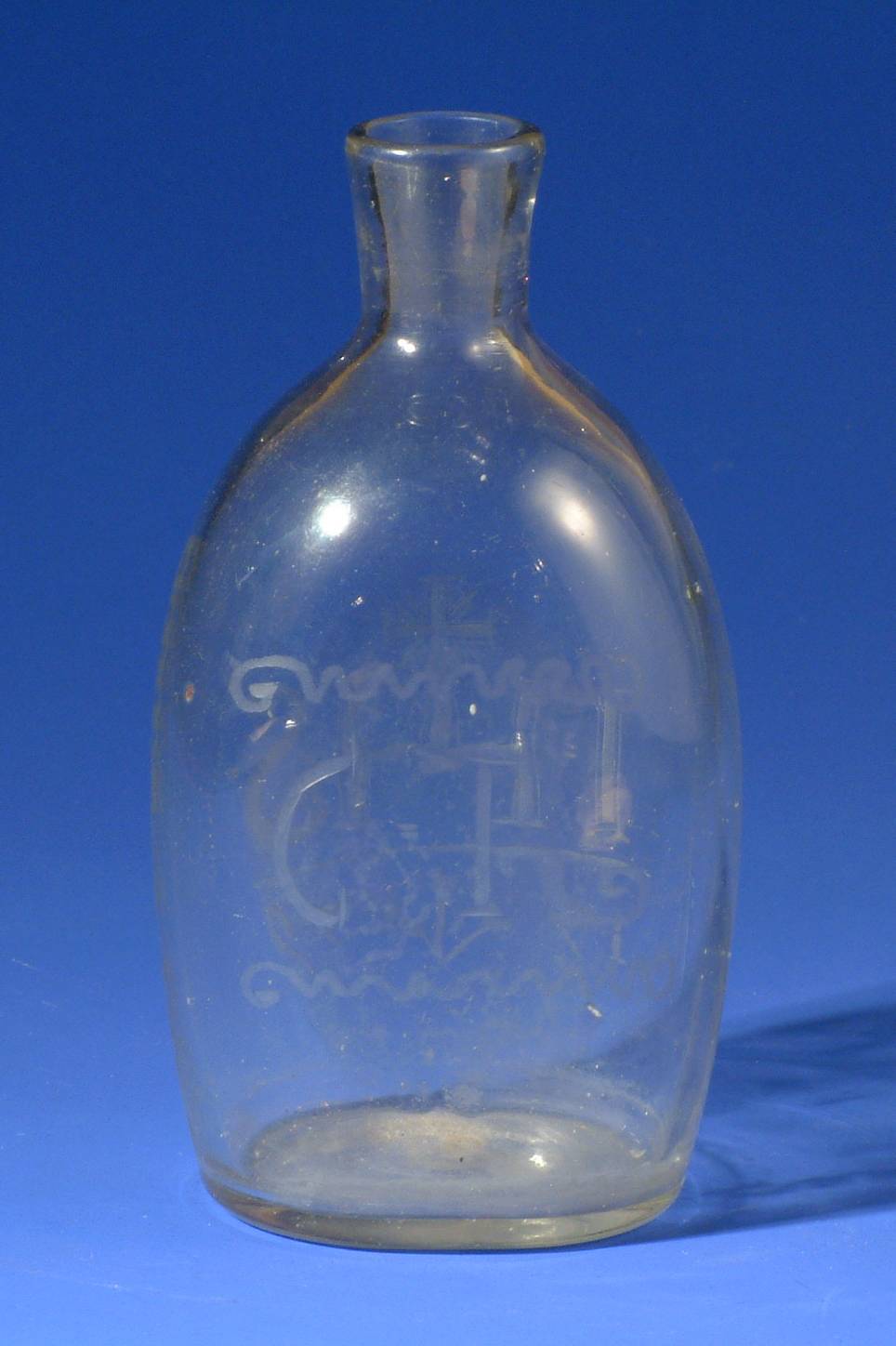 glazen flesje met in radgravure de letters IHS en kruis (Christussymbool)