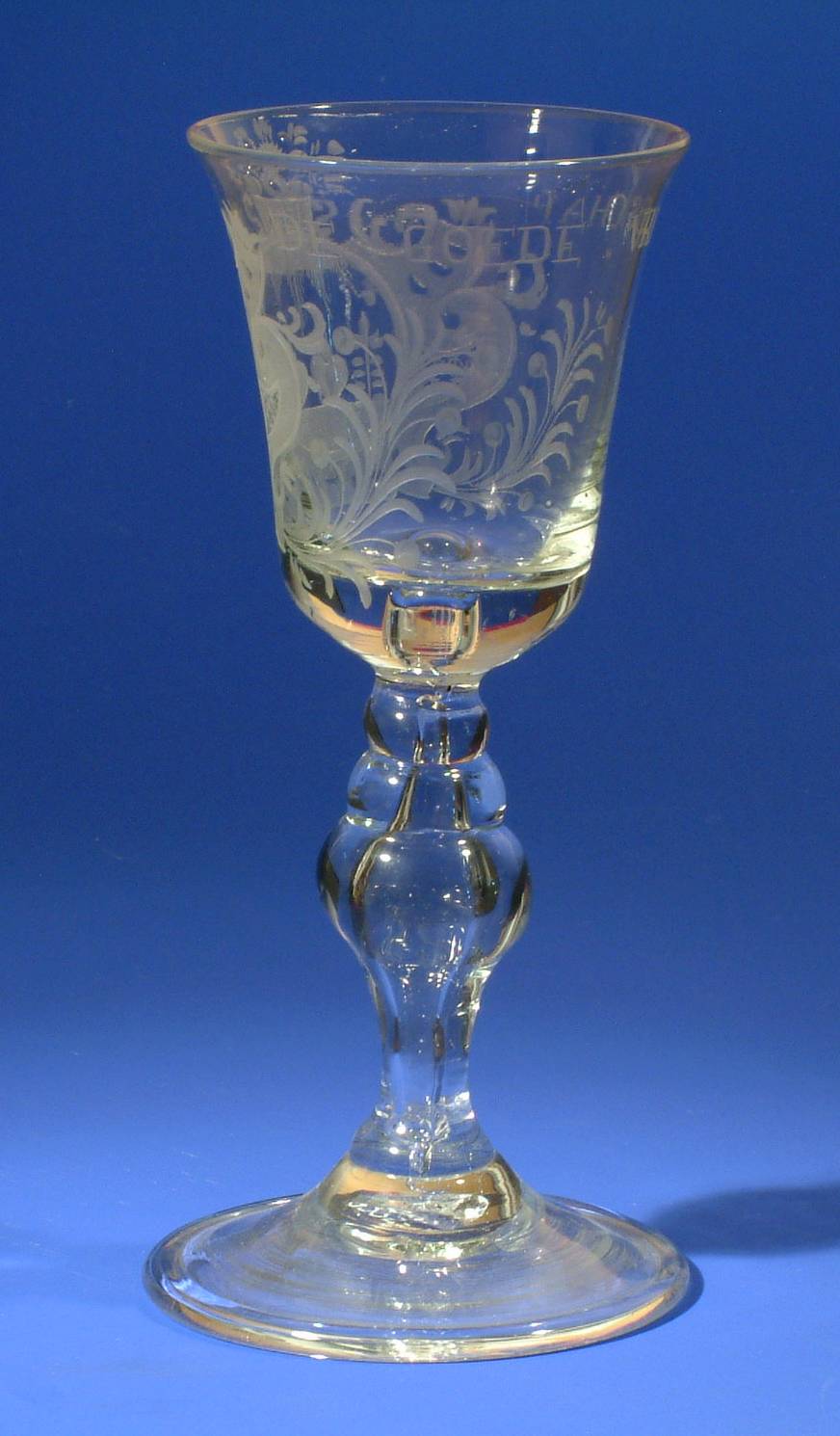 kelkglas gegraveerd met twee harten en een bloemenmand. DE GOEDE VRINDSCHAP