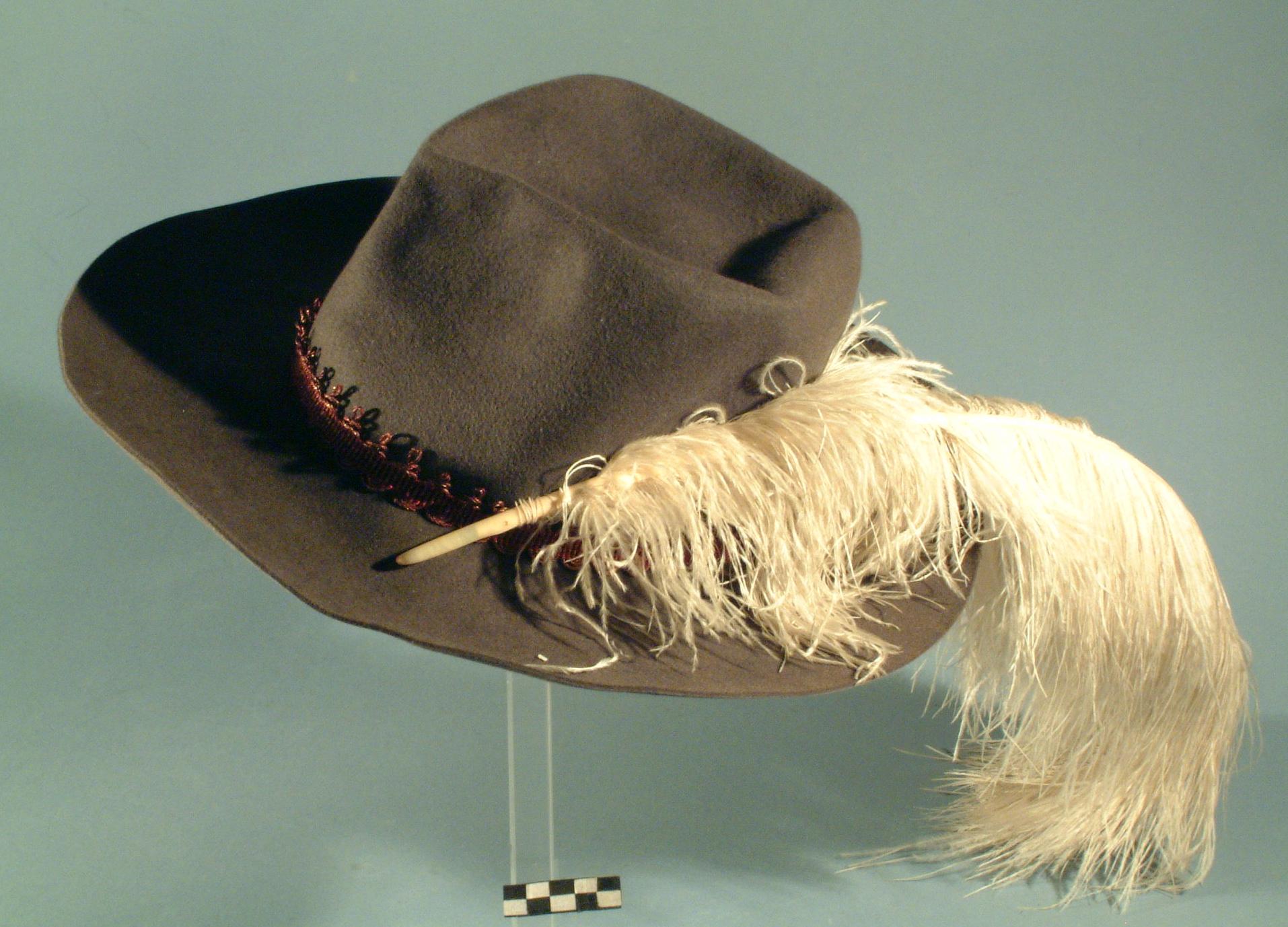 Donkergrijze herenhoed met veer en band