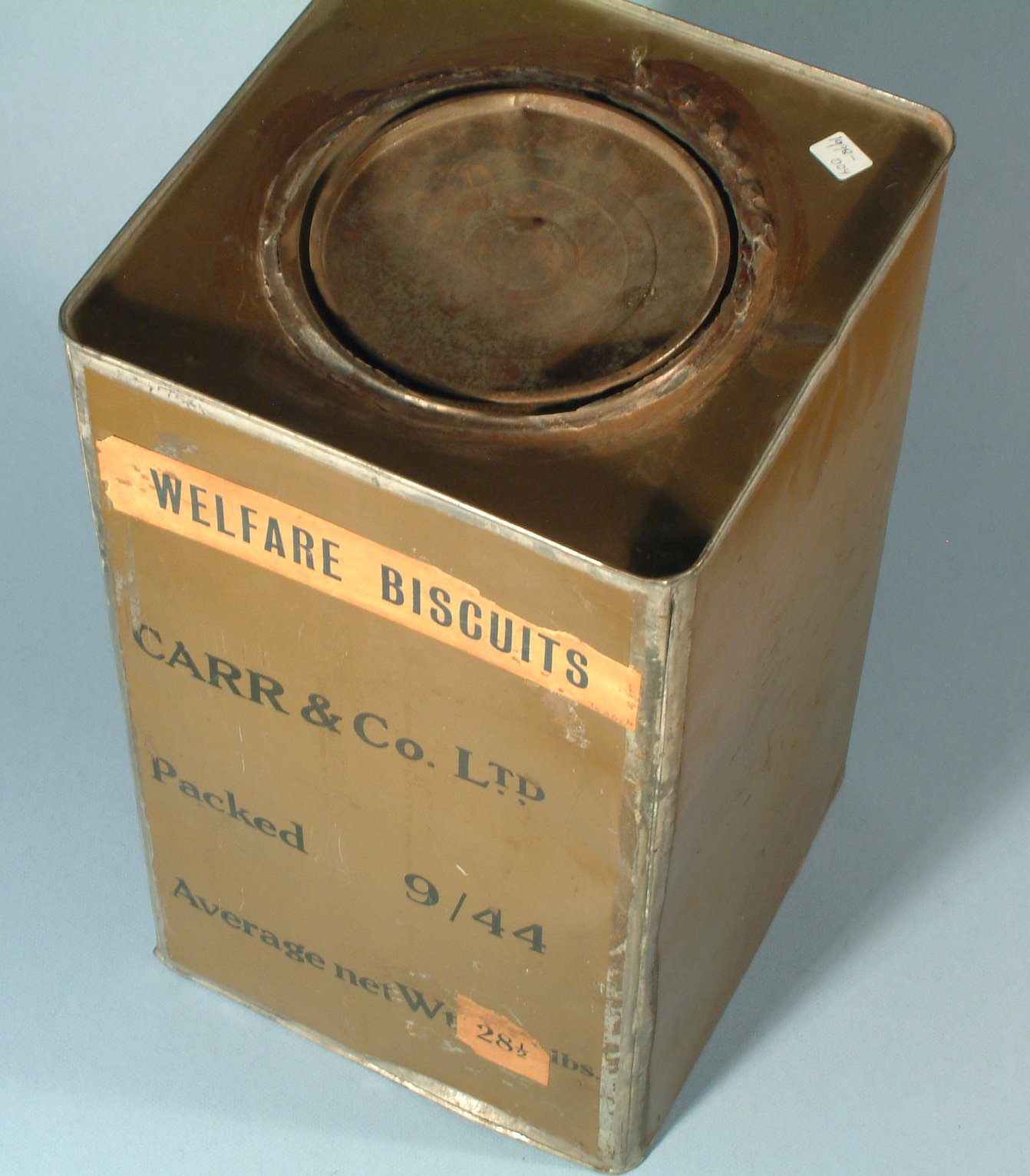 Blik welfare biscuits, groengeverfd.