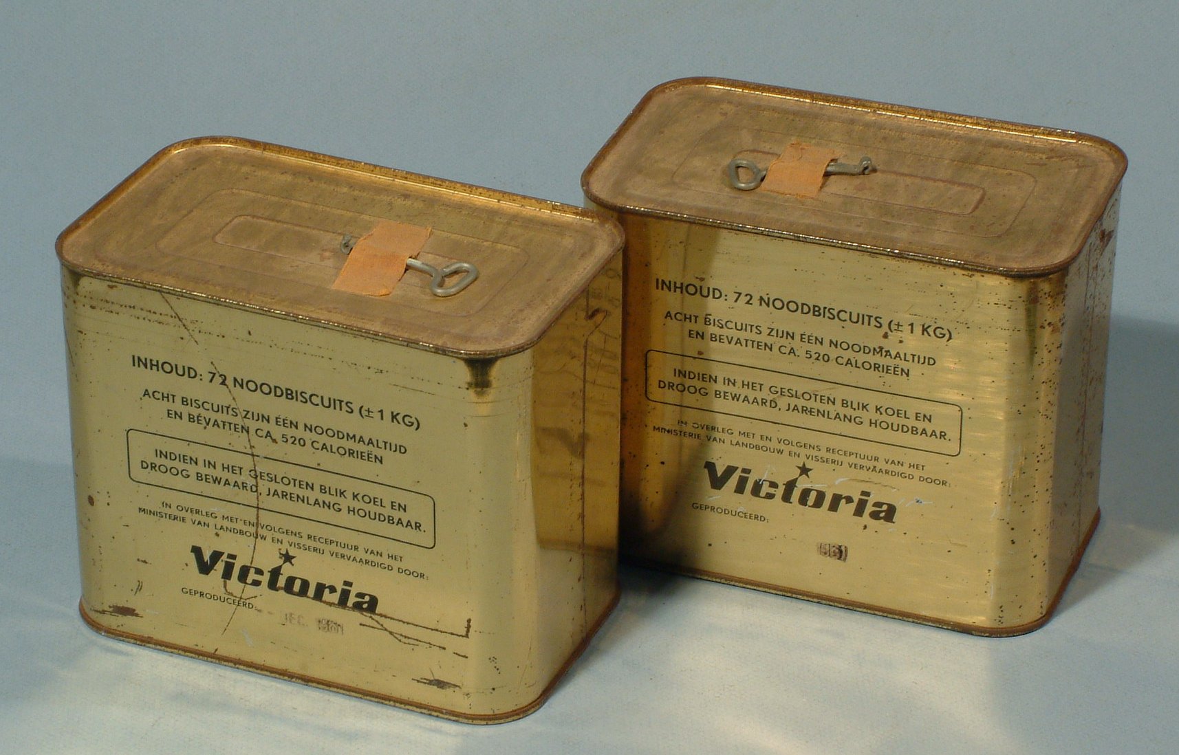 Twee metalen blikken met noodbiscuits