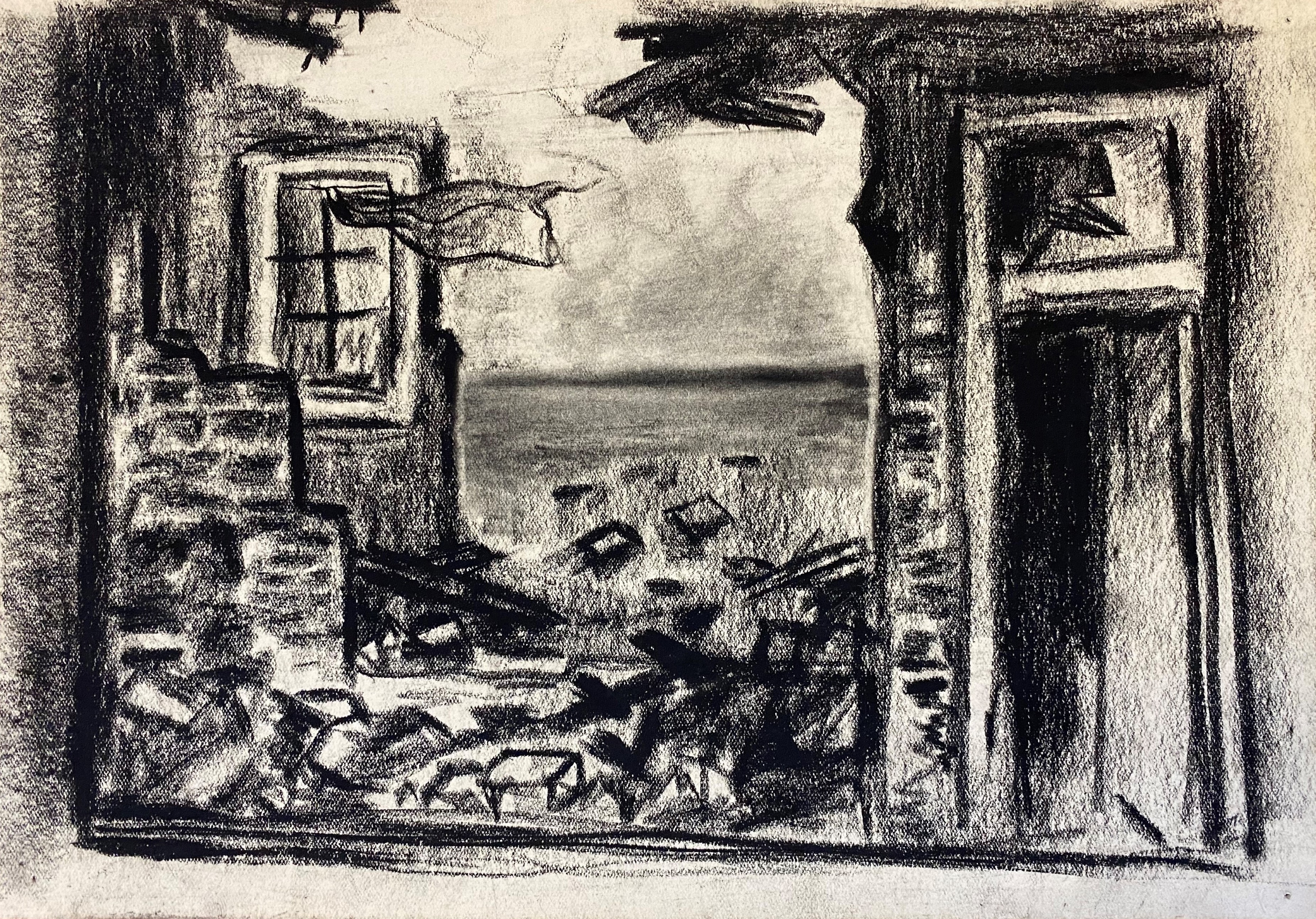 Bouwval met wapperende vitrage