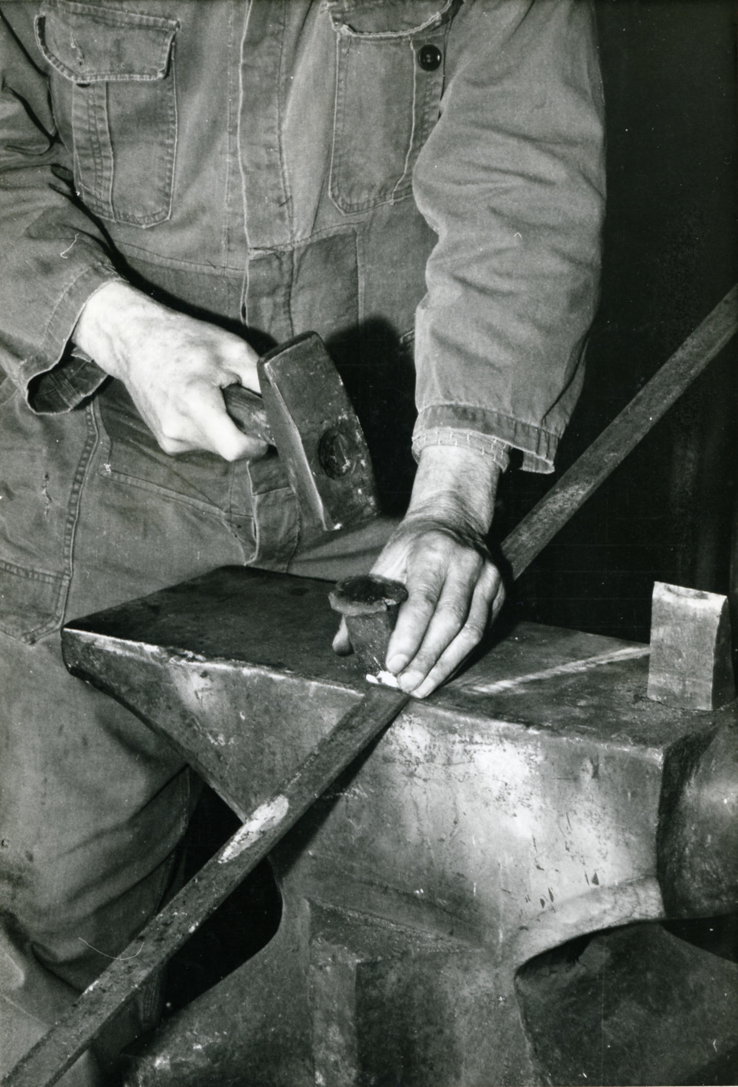 Smid Groeneweg uit Puttershoek demonstreert in april 1967 de vervaardiging van een riethaak. Eerst wordt van een ijzeren strip een stuk van 53 centimeter afgekort. Dit gebeurt door met een smeedhamer en een handbeitel een keep in de strip te slaan, waarna het stuk eraf gewrikt kan worden. Het ijzer is nog onverhit. De ijzeren ...