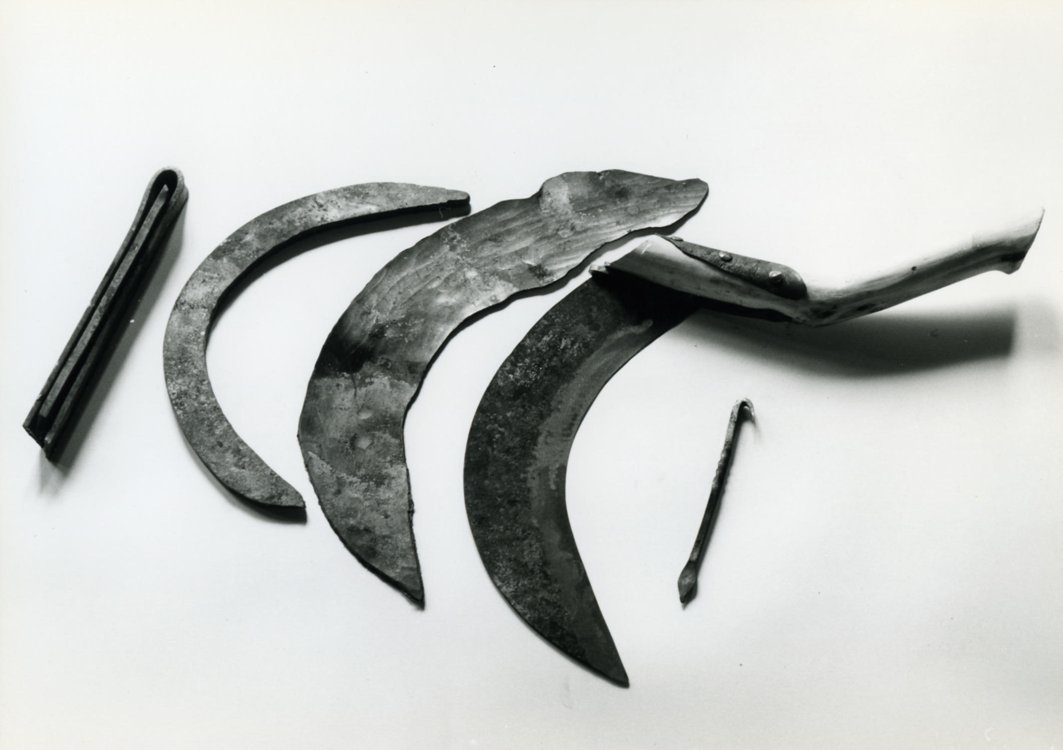De verschillende stadia van het smeden van een riethaak, volgens de werkwijze van smid Groeneweg uit Puttershoek. Links een dubbelgevouwen stuk ijzer met een stuk staal ertussen. Daarnaast een aan elkaar geweld en in model geslagen stuk ijzer, waartussen het staal is gesmeed. In het volgende stadium is het kromme stuk ijzer plat uitgeslagen en ...