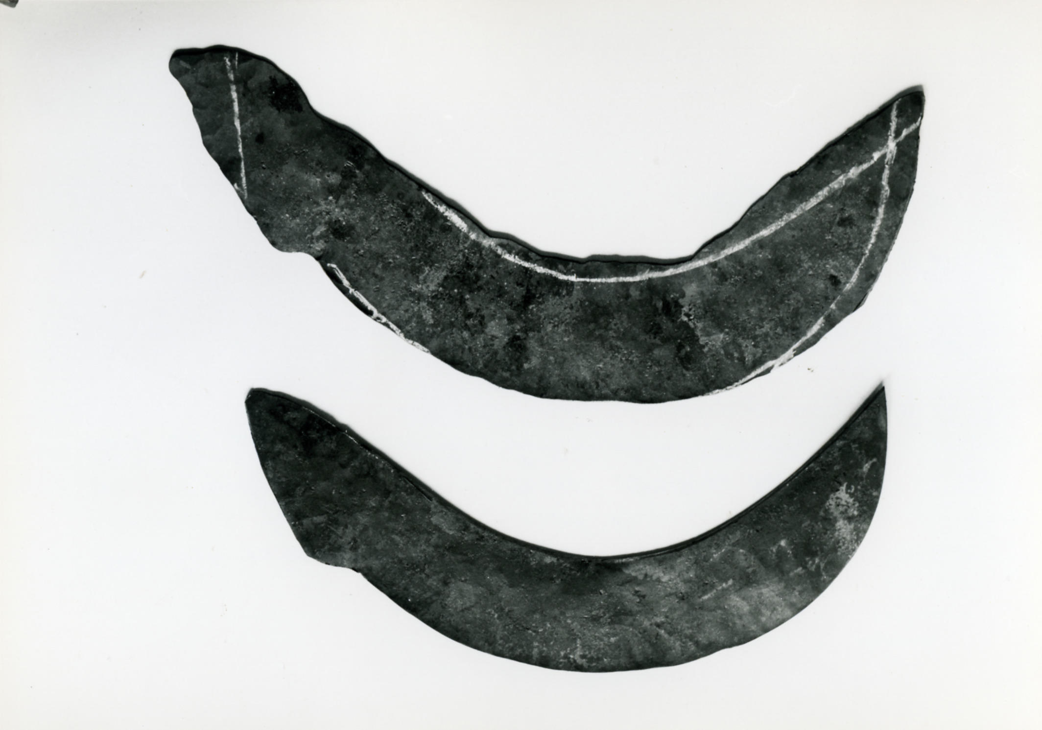 Verschillende stadia van de vervaardiging van een riethaak door smid Groeneweg uit Puttershoek. Boven: het aan elkaar gewelde en in model geslagen stuk metaal is uitgesmeed tot de grootste breedte in het midden 8 centimeter is en het metaal langs de buitenrand 3 tot 4 centimeter dik is. Het uiteindelijke model is vervolgens met krijt ...