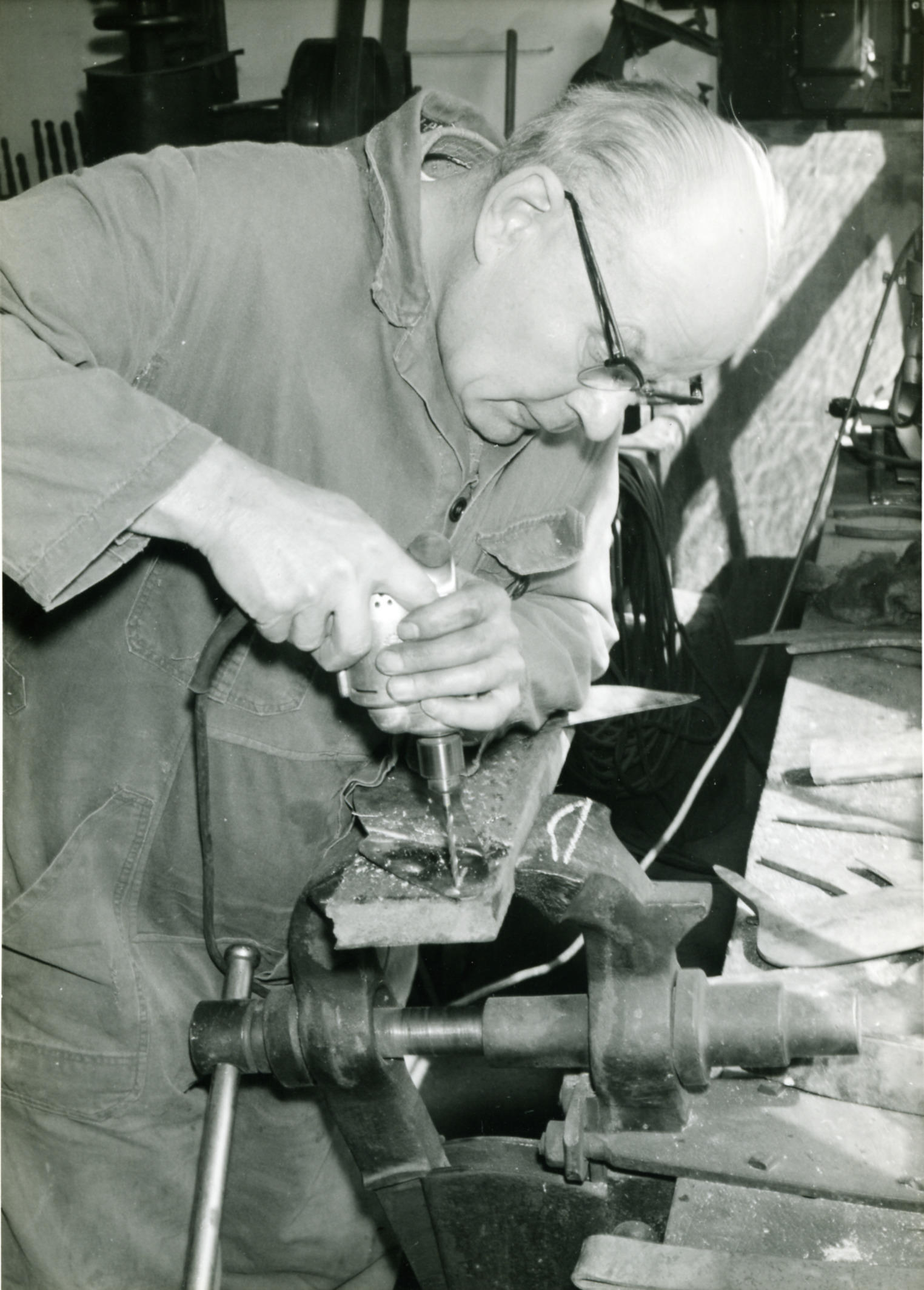 Smid Groeneweg uit Puttershoek demonstreert in april 1967 de vervaardiging van een riethaak. Op de plaats van het steelhuis boort Groeneweg met een elektrische boormachine vijf gaten in het metaal. Hierdoor komen de spijkers die het houten handvat in het steelhuis verankeren.