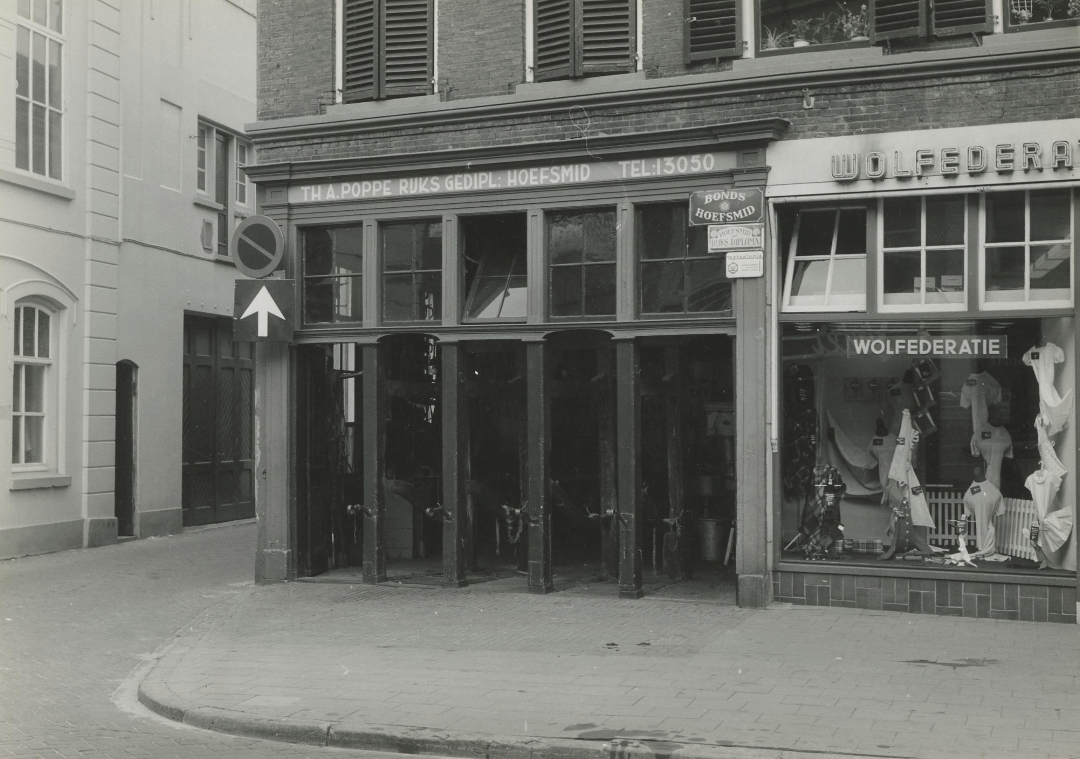 Hoefsmederij van Th. A. Poppe aan de Luttekestraat in Zwolle. Rechts is een winkel van de Wolfederatie te zien.