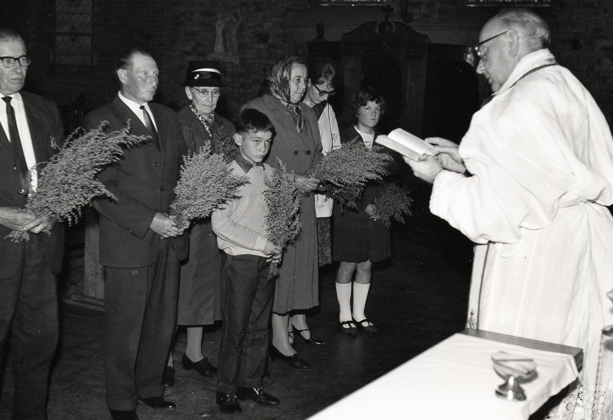 In een kerkinterieur staan twee mannen, twee vrouwen, twee meisjes en een jongen voor pastoor L.W. Weys. Zij kijken allen naar de pastoor die uit een gebedenboek leest en hebben een kruidenbos voor zich, de kruidwis, die door de pastoor op de feestdag Maria Hemelvaart gezegend wordt. De zegening van kruidwis op Maria Hemelvaart (15 ...