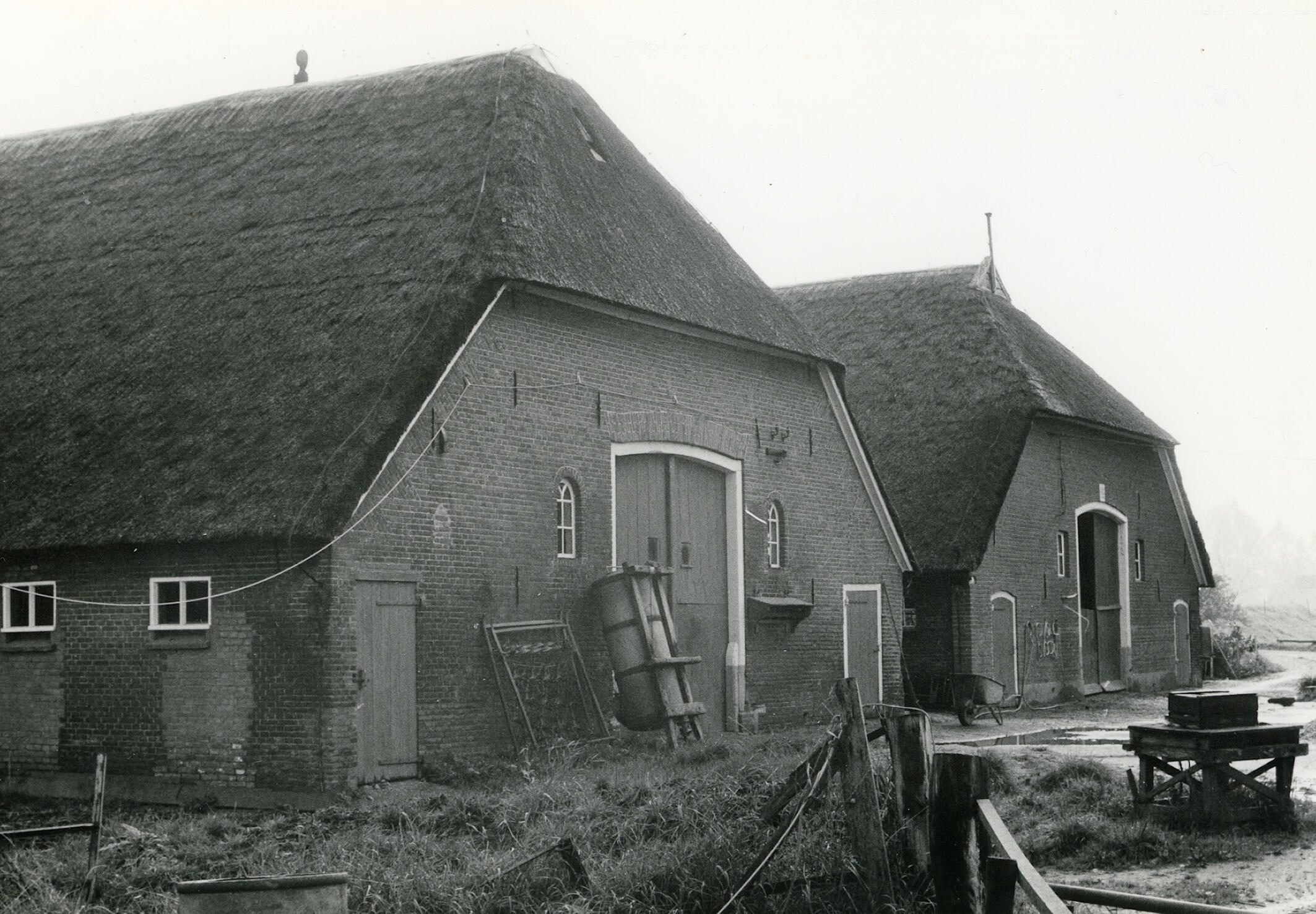 Achterzijde van boerderij 'De Voorn' aan de IJsseldijk 8 in Oene. Links staat de schuur en rechts de boerderij. In de sluitsteen boven de inrijdeur in de achtermuur van de boerderij staat: 'T H S / IMLB / 1844'. Tegen de achtergevel van de schuur staat een giertank. Rechts van de inrijdeur van de schuur ...