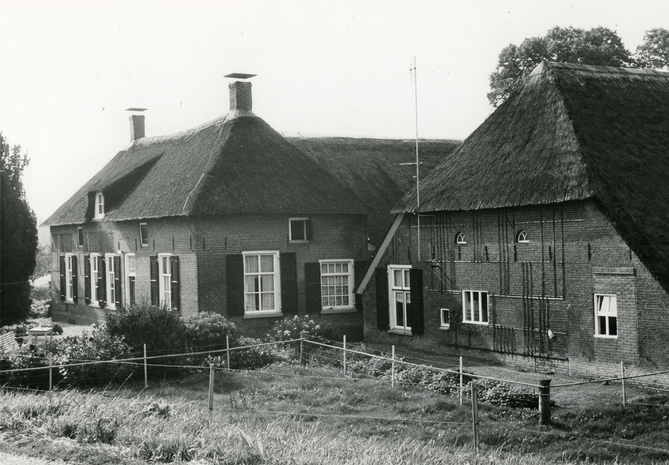 Voorzijde van boerderij 'De Voorn' aan de IJsseldijk 8 in Oene. Links staat de boerderij en rechts een schuur. Het woonhuis is dwars voor het bedrijfsgedeelte gebouwd. In de sluitsteen boven de inrijdeur in de achtermuur van de boerderij staat: 'T H S / IMLB / 1844'.