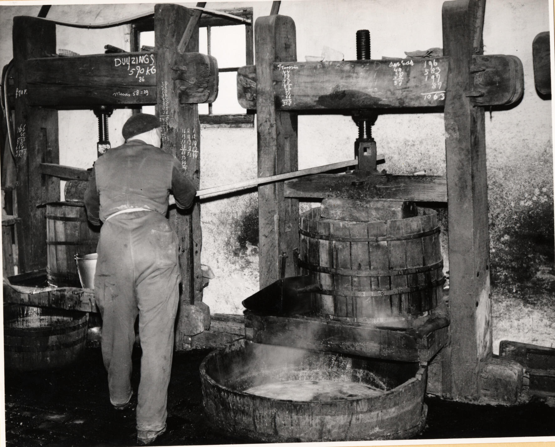 Stroopkoker Eduard Duyzings bij een vruchtenpers in zijn stroopkokerij in Thull, gemeente Schinnen. Nadat de vruchten in een koperen kookketel gekookt zijn, wordt de vruchtenmassa in deze vruchtenpersen uitgeperst. Eduard gebruikt een lange stang als persboom om de pers steviger aan te draaien. Het sap loopt uit de perskuip in de vierkante bak eronder, en ...