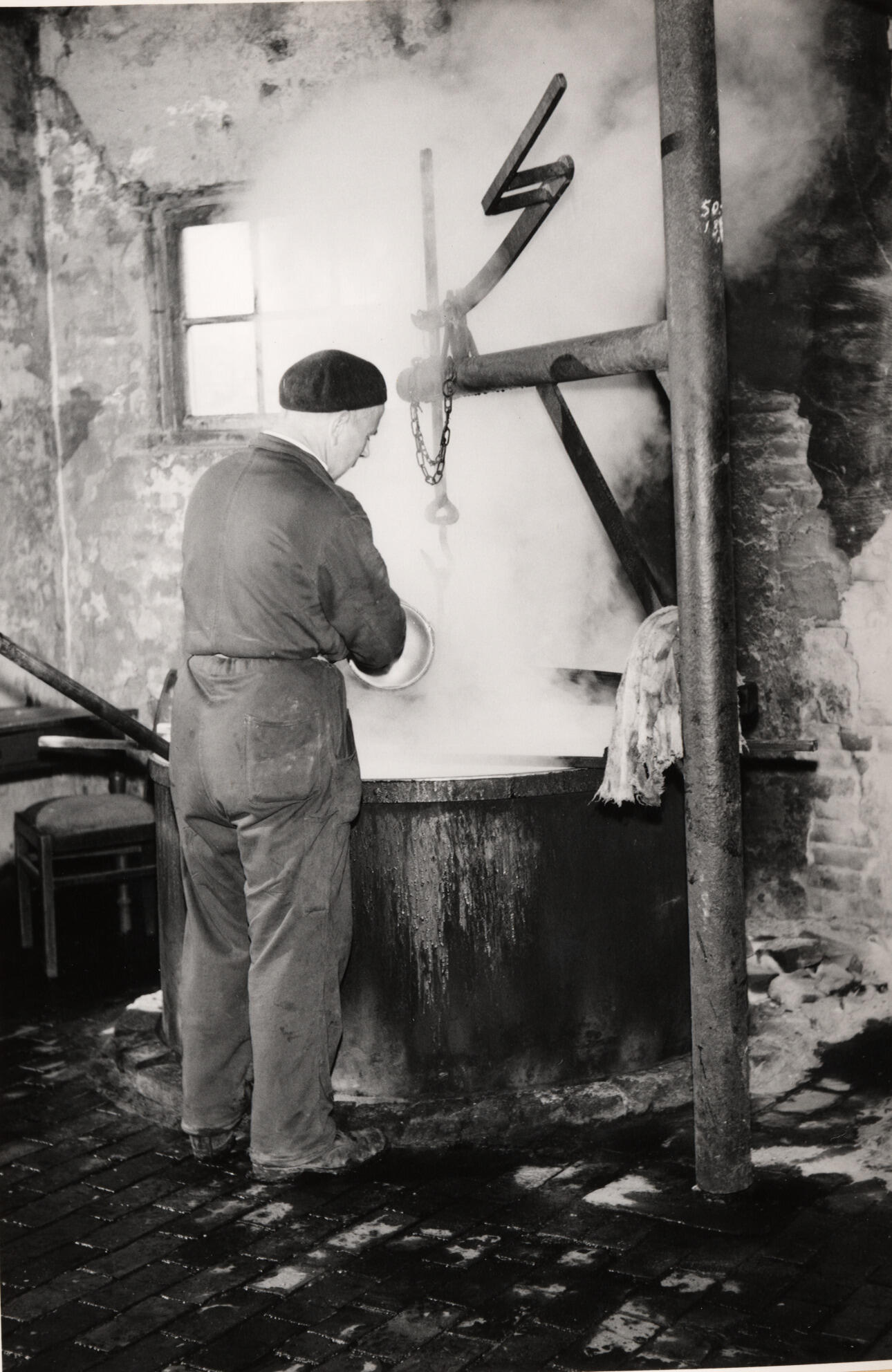 Stroopkoker Eduard Duyzings bij de kookketel in zijn stroopkokerij in Thull, gemeente Schinnen. Nadat de vruchten in deze koperen kookketel gekookt zijn, wordt de vruchtenmassa in een vruchtenpers uitgeperst. Het sap wordt vervolgens met een houten schep in een emmer geschept en in de koperen kookketel gegoten. Hierin zal het sap ingekookt worden tot stroop.