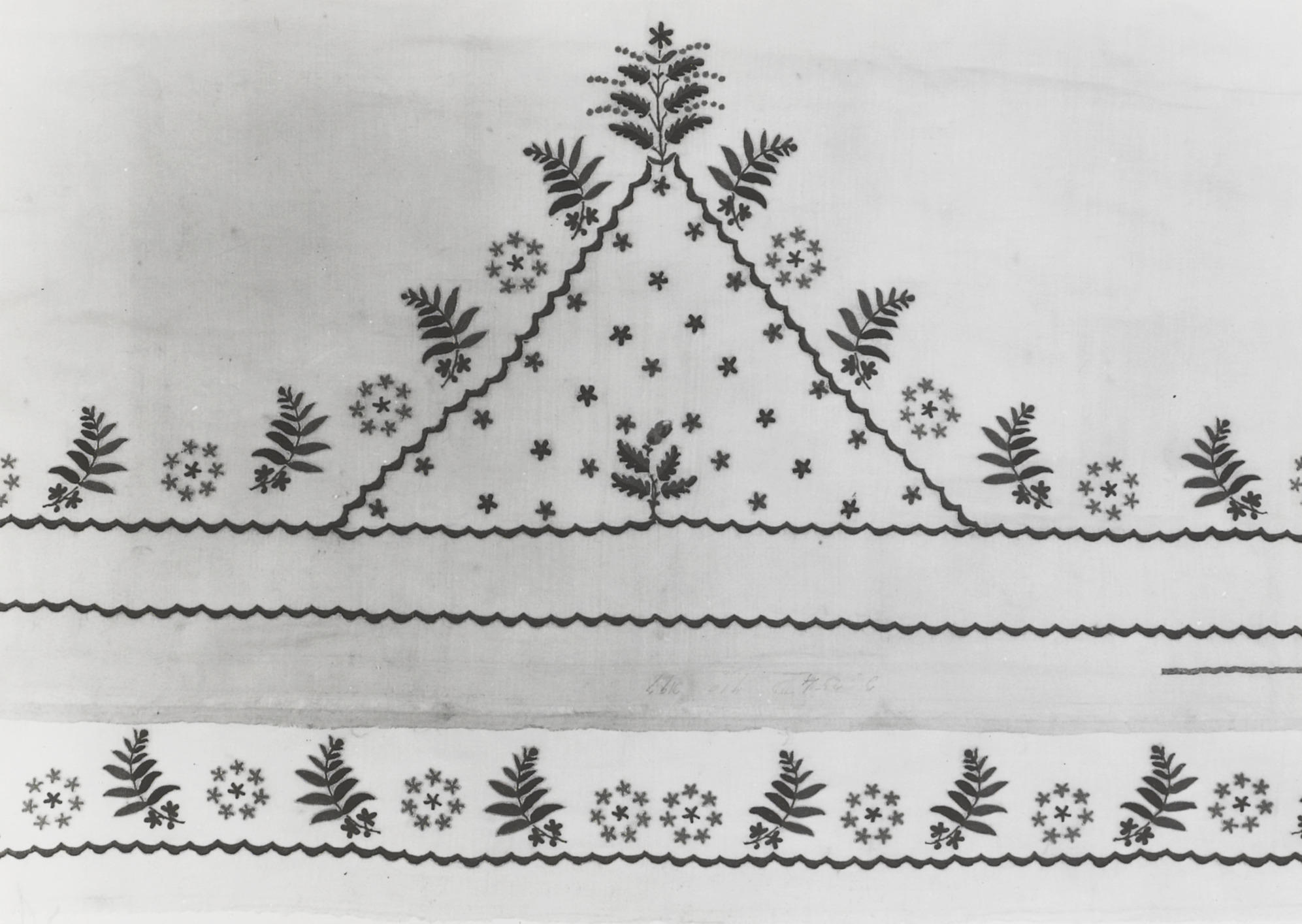 Uiteinden van een lap neteldoek van batist, opgeborduurd in groen en rood. Het bovenste deel op de foto is de voorzijde; de onderrand is de achterzijde.