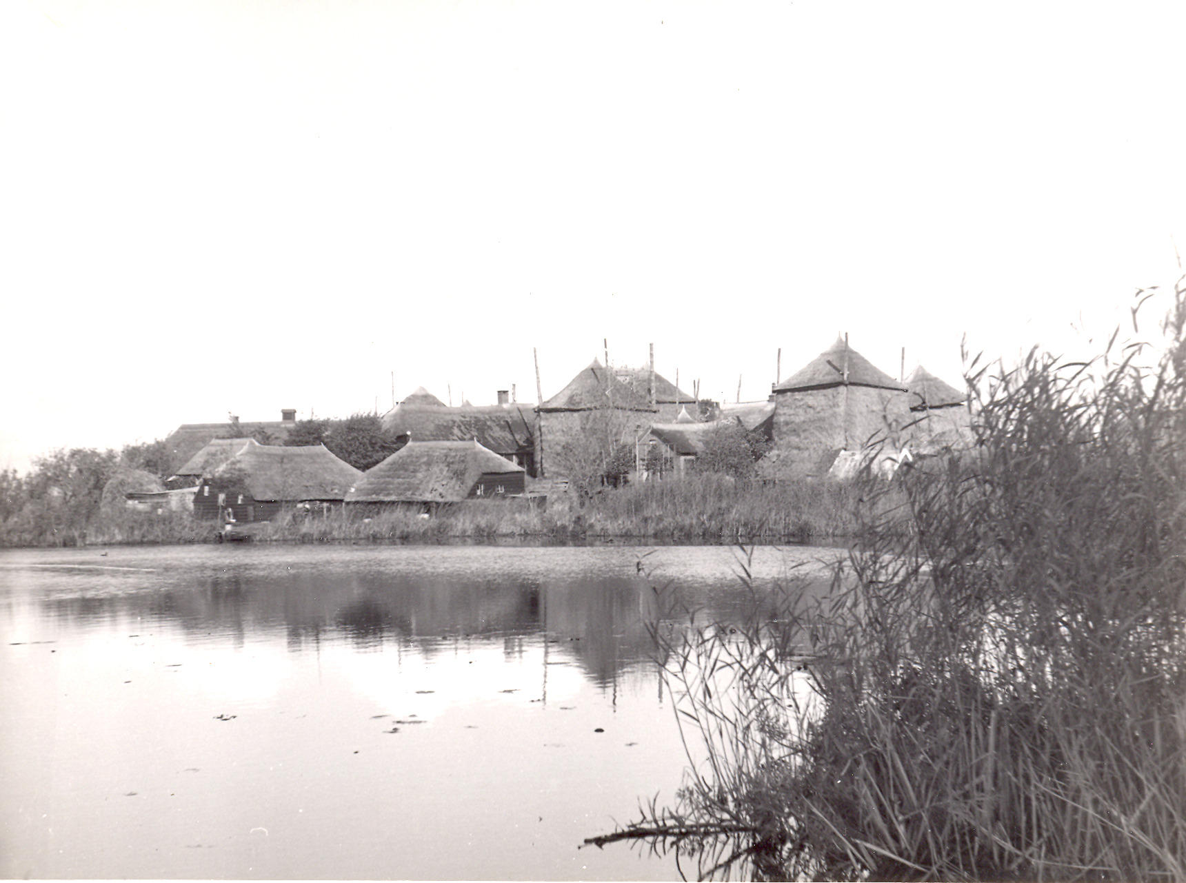 Boerderijen met hooibergen, Kamperzeedijk, circa 1940 (zwart-wit negatief)