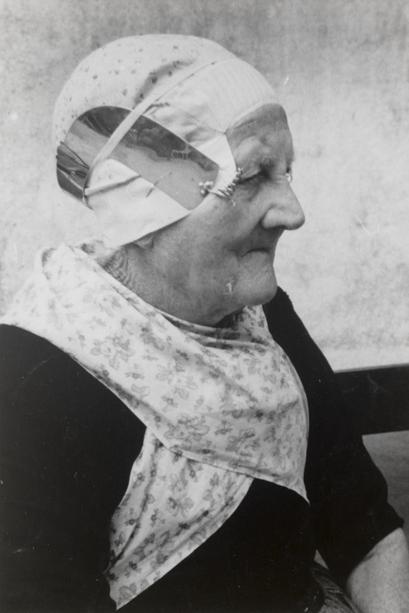 Vrouw uit Hierden, gekleed in de streekdracht van de Noordwest-Veluwe. De vrouw is gekleed in opknapdracht. De zogenoemde tipmuts, de gedessineerde ondermuts, is rondom afgezet met langetband. Over de tipmuts draagt ze een smal zilveren oorijzer met gouden krullen aan beide uiteinden.