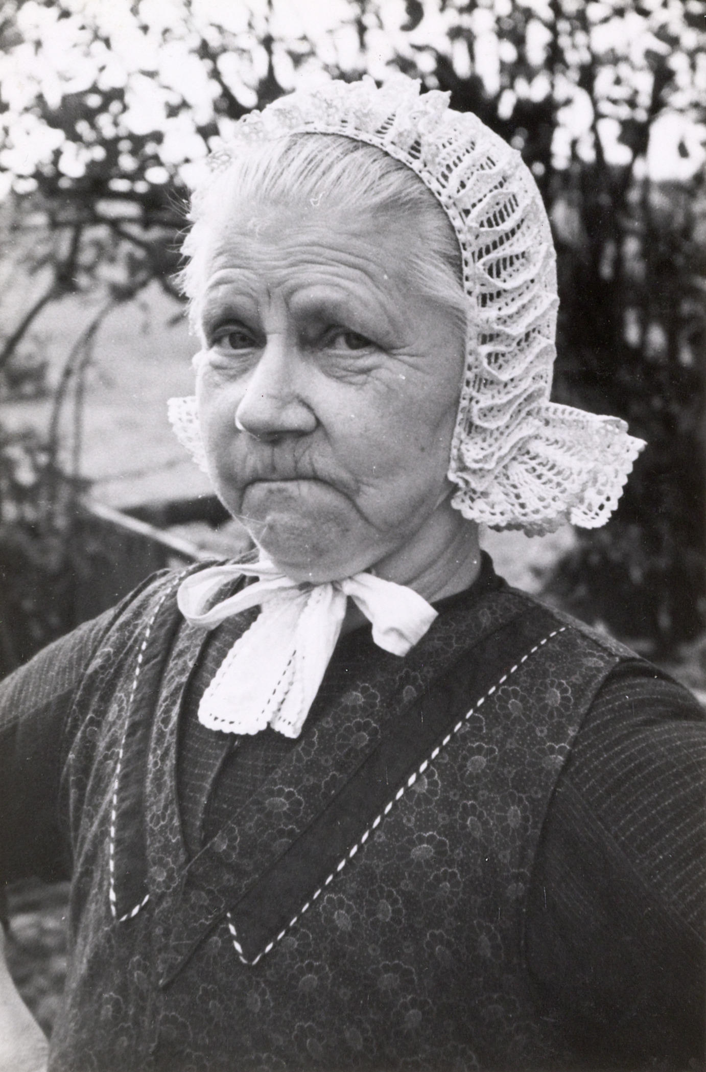 Vrouw in Friese streekdracht. De vrouw draagt een gehaakte werkmuts. De voorrand, de zogenoemde hanekam, is gevormd door een in lussen gelegde gehaakte strook.