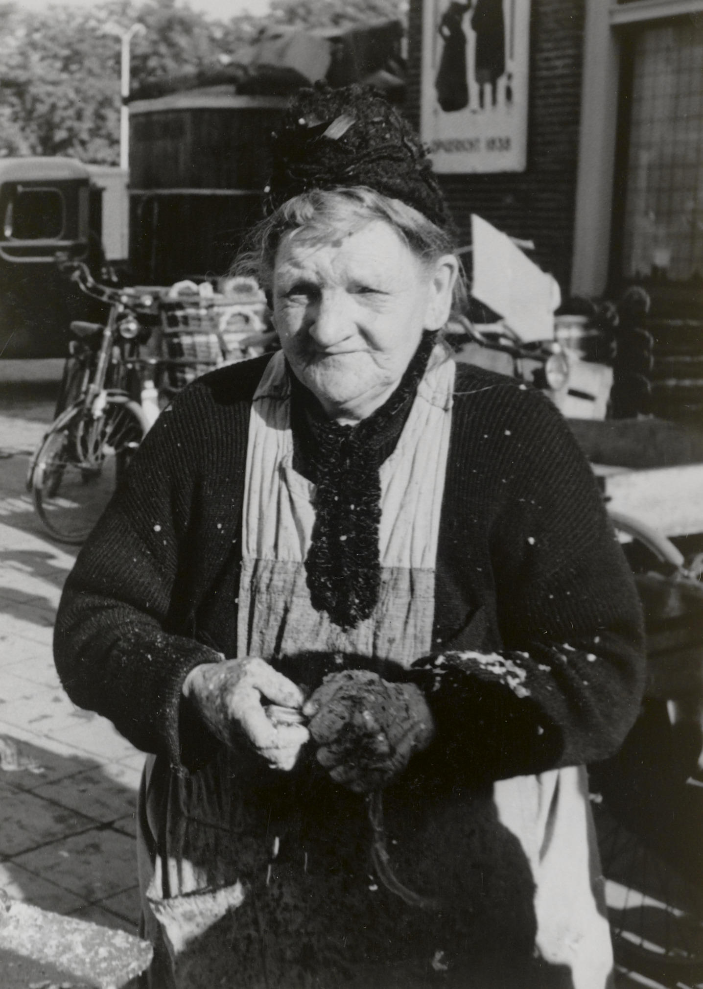 De bekende Zwolse visverkoopster Rike op de markt. Op haar hoofd draagt zij een kaper.