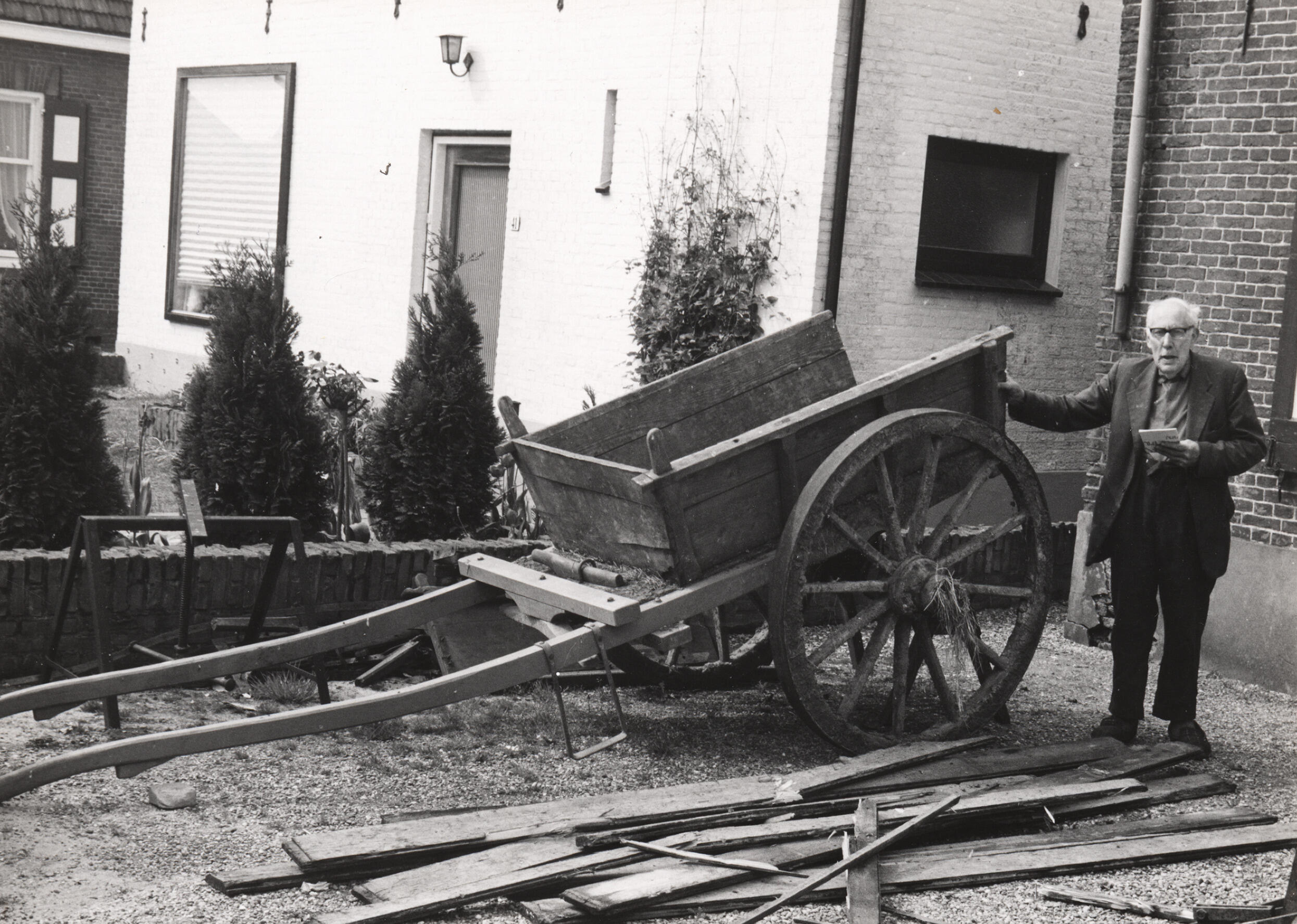 Tweewielige kipkar uit de Vijfherenlanden voor reparatie bij de wagenmakerij van W. Bikker sr. in Lexmond.