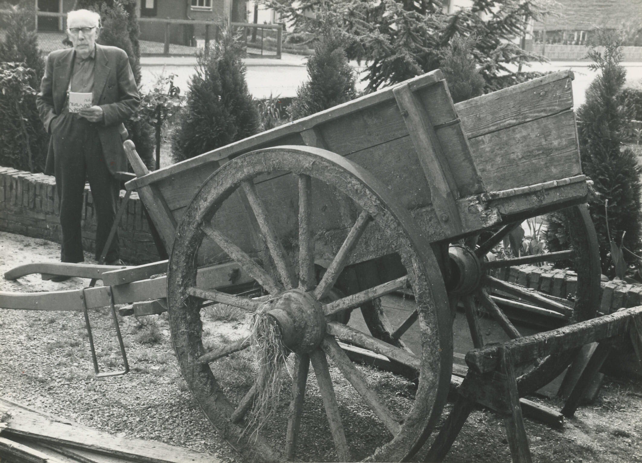 Tweewielige kipkar uit de Vijfherenlanden voor reparatie bij de wagenmakerij van W. Bikker sr. in Lexmond.