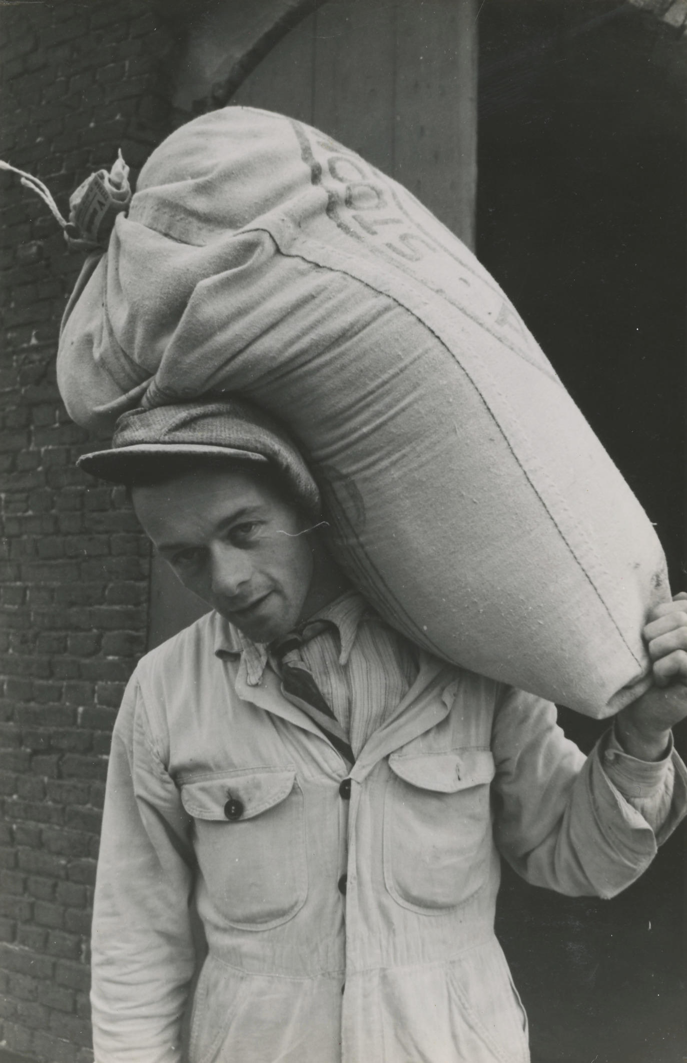 Molenaarsknecht in Gameren. Op zijn schouder draagt hij een gevulde zak.