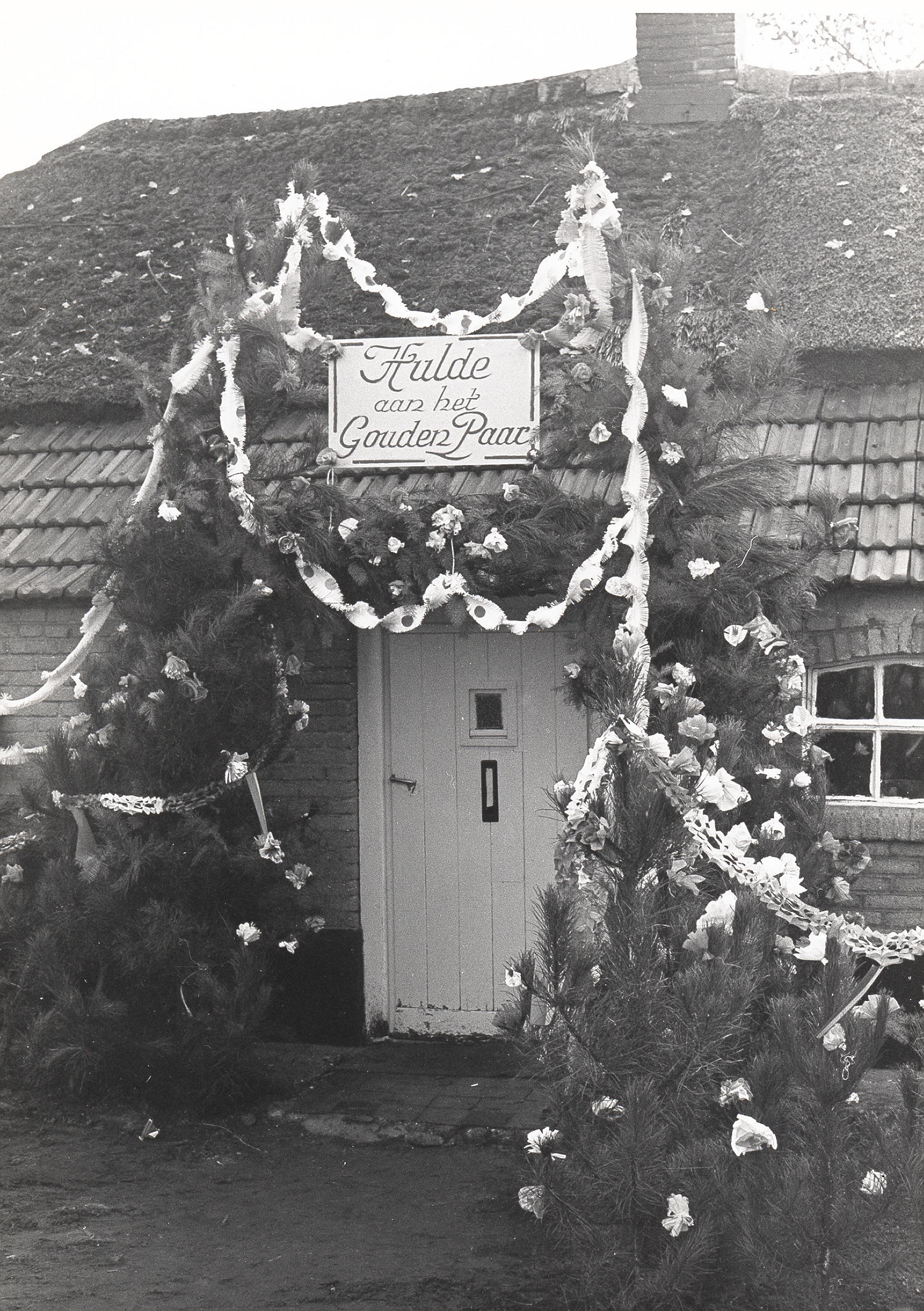 Door buurtbewoners aangebrachte versieringen aan de woning van Johannes Romme en Maria Romme-Strik in Heesch. Johannes en Maria zijn getrouwd op 23 november 1920 en vieren in 1970 hun vijftigjarig huwelijksjubileum.