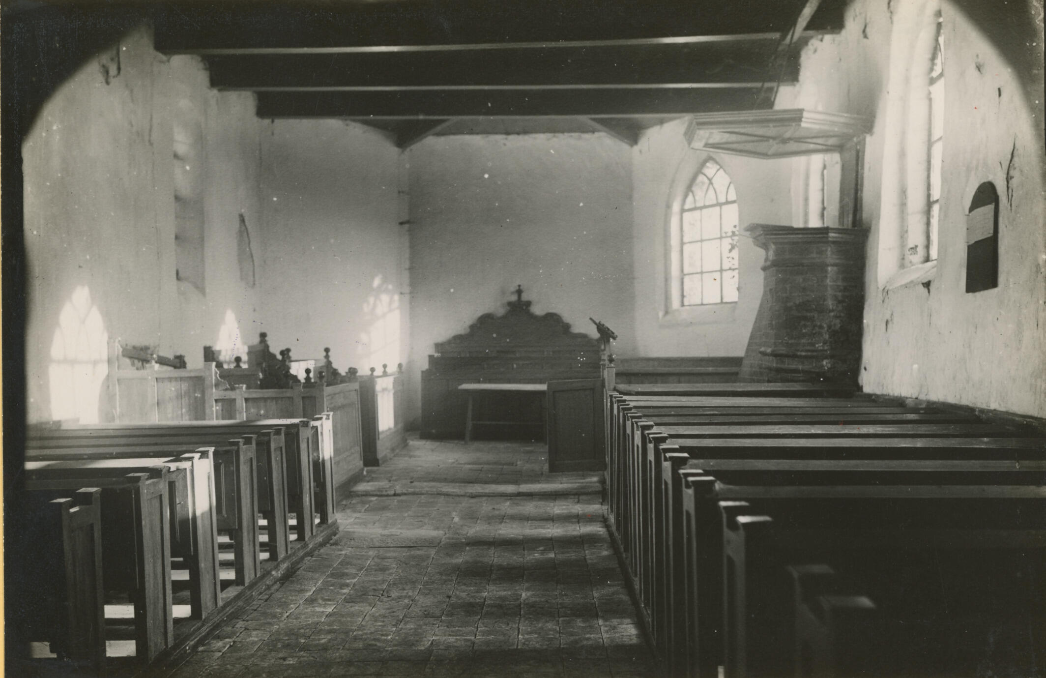 Het interieur van de Nederlands hervormde kerk in Fransum, Groningen. De kerk is gebouwd in het begin van de dertiende eeuw. In het kerkje staat de oudste bakstenen preekstoel van Nederland, vervaardigd in de veertiende of vijftiende eeuw. In 1909 werd de laatste kerkdienst gehouden in de kerk. In de jaren dertig waren er plannen ...