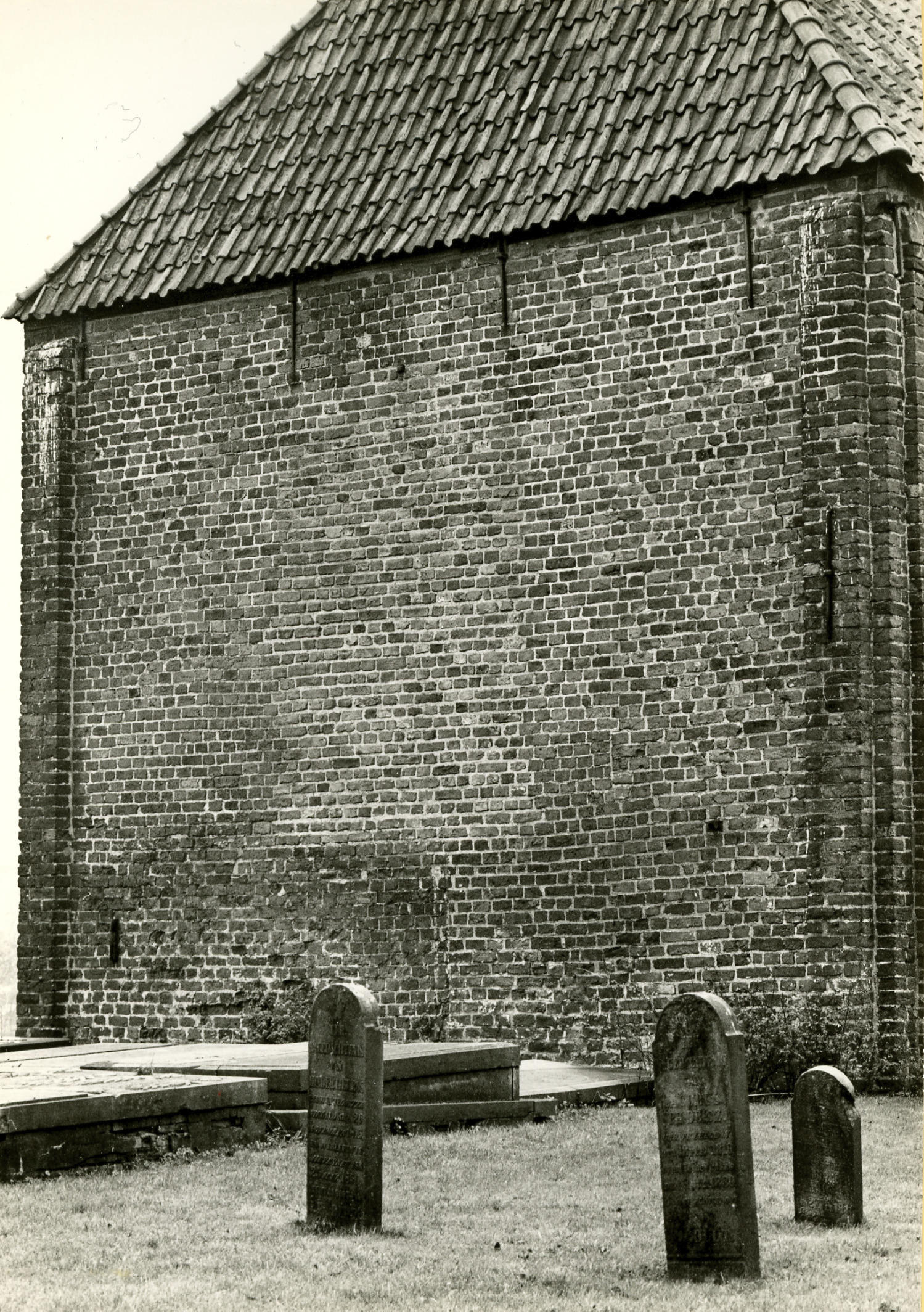 Achtergevel van de kerk in Heveskes. Het Groningse dorp Heveskes werd in de periode 1960-1975 afgebroken ten behoeve van de uitbreiding van industriegebieden rond Delfzijl. Uiteindelijk bleef alleen de kerk van Heveskes gespaard. In 1974 werd geopperd om de kerk te verplaatsen naar het Nederlands Openluchtmuseum in Arnhem, maar dit is niet gebeurd.