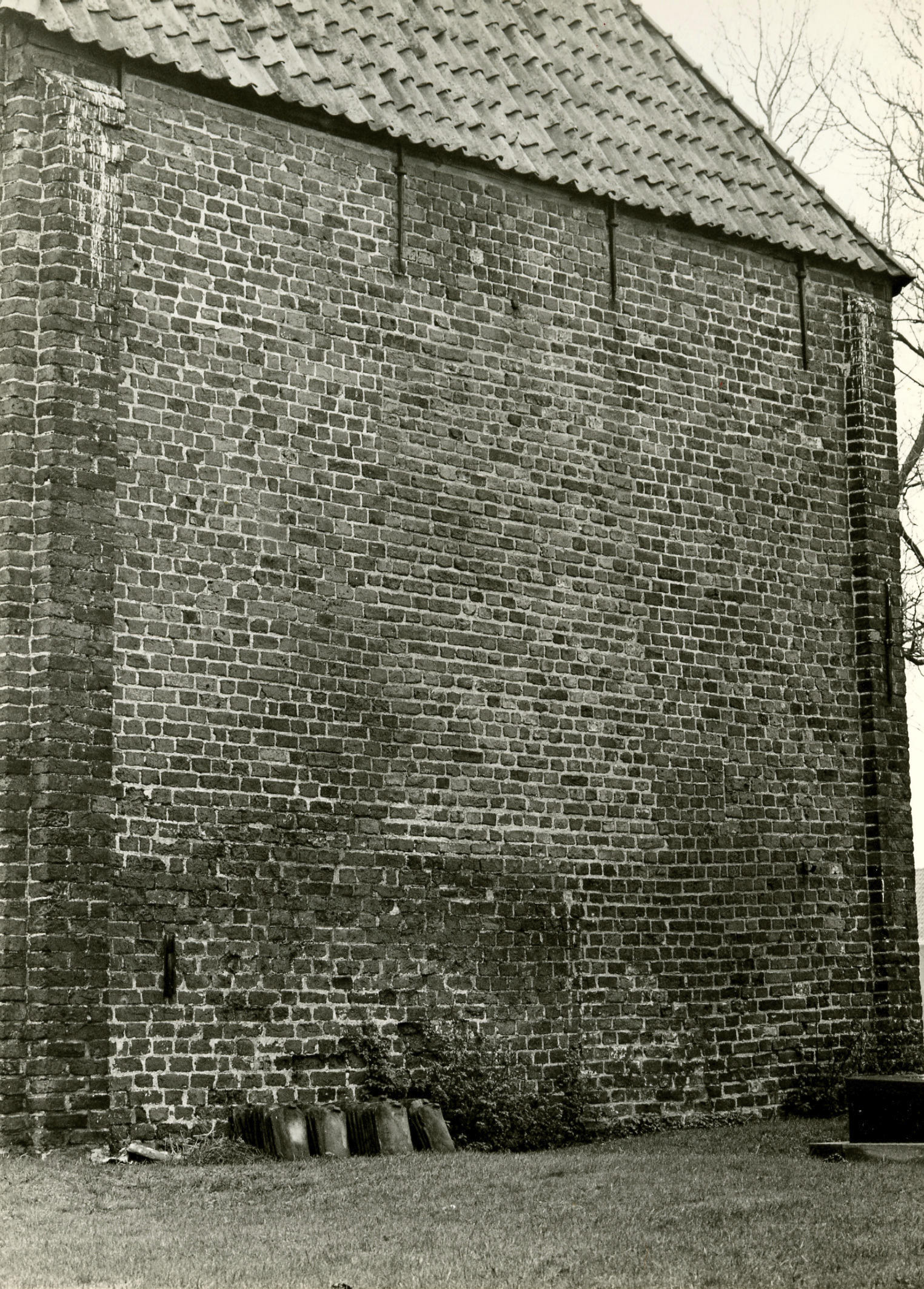 Achtergevel van de kerk in Heveskes. Het Groningse dorp Heveskes werd in de periode 1960-1975 afgebroken ten behoeve van de uitbreiding van industriegebieden rond Delfzijl. Uiteindelijk bleef alleen de kerk van Heveskes gespaard. In 1974 werd geopperd om de kerk te verplaatsen naar het Nederlands Openluchtmuseum in Arnhem, maar dit is niet gebeurd.