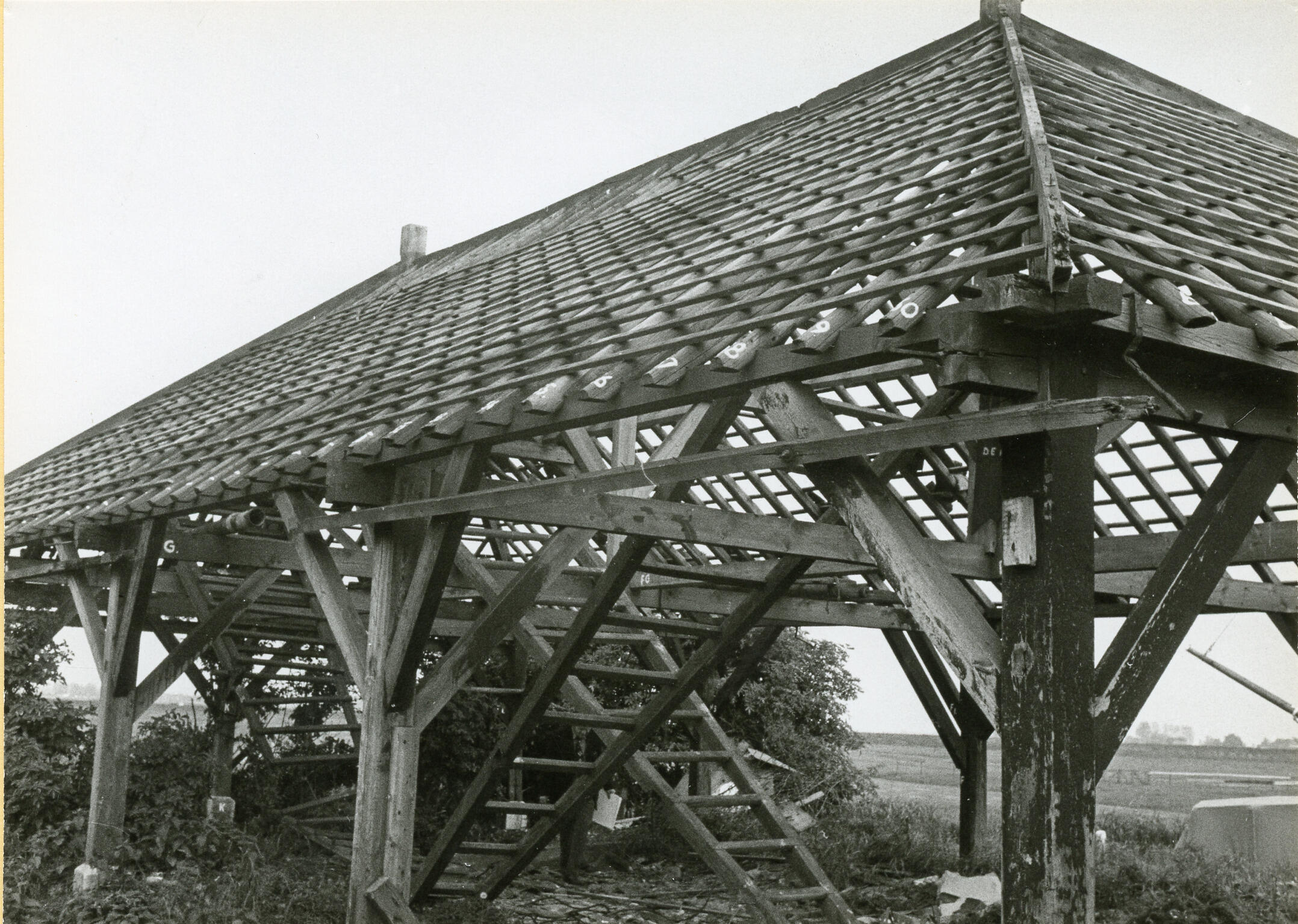 Fecaliënloods in IJlst (Friesland), gefotografeerd tijdens de demontage in 1975. In de loods werden ingezamelde menselijke uitwerpselen vermengd met 'ruigte' (organisch materiaal), waarna het geheel als compost werd verkocht. In december 1885 werd de loods in gebruik genomen. De onderdelen van de loods werden in 1975 overgebracht naar het Nederlands Openluchtmuseum, maar niet herbouwd. De ...