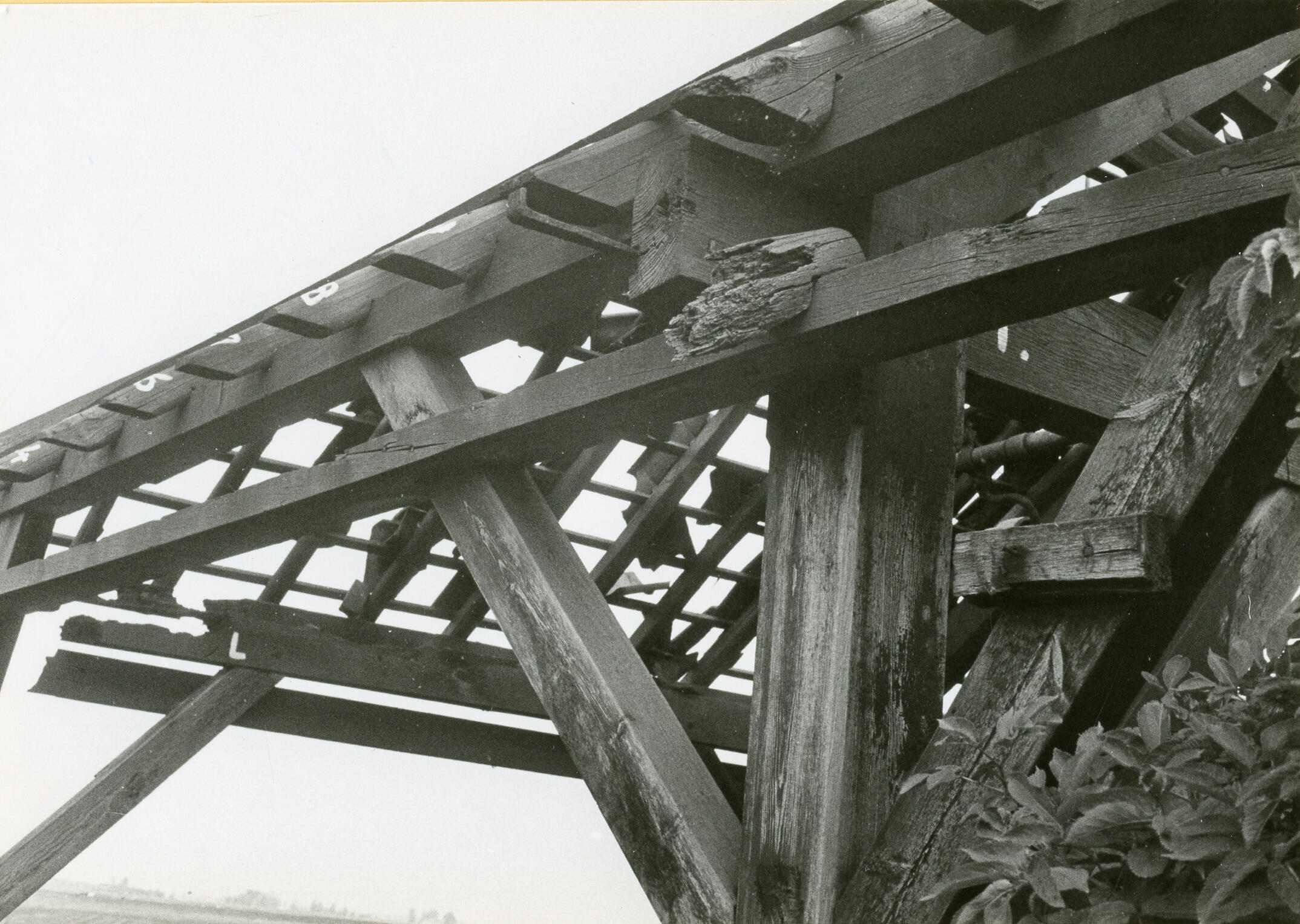 Kap- en gebintconstructie van de fecaliënloods in IJlst (Friesland), gefotografeerd tijdens de demontage in 1975. In de loods werden ingezamelde menselijke uitwerpselen vermengd met 'ruigte' (organisch materiaal), waarna het geheel als compost werd verkocht. In december 1885 werd de loods in gebruik genomen. De onderdelen van de loods werden in 1975 overgebracht naar het Nederlands ...