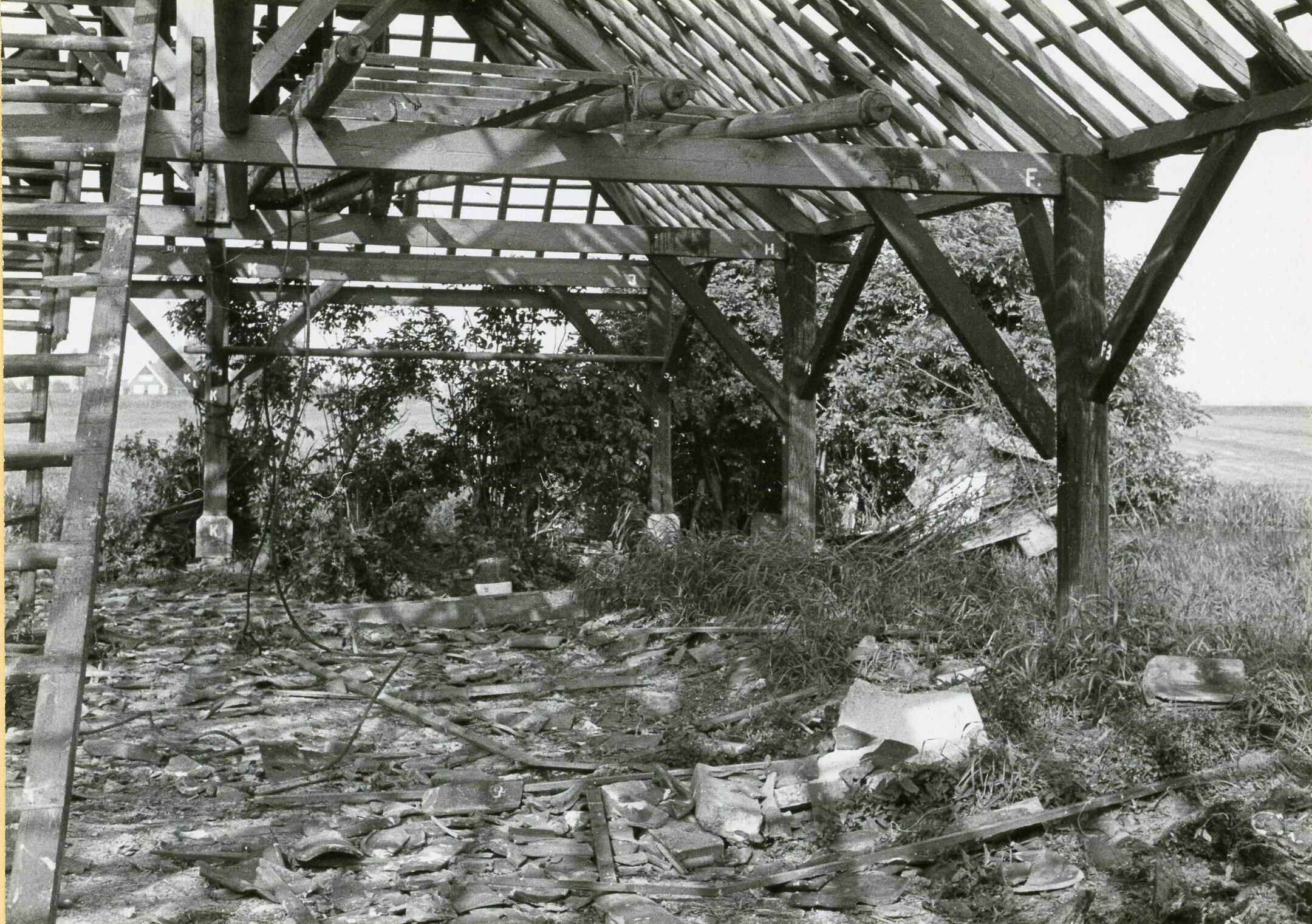 Fecaliënloods in IJlst (Friesland), gefotografeerd tijdens de demontage in 1975. In de loods werden ingezamelde menselijke uitwerpselen vermengd met 'ruigte' (organisch materiaal), waarna het geheel als compost werd verkocht. In december 1885 werd de loods in gebruik genomen. De onderdelen van de loods werden in 1975 overgebracht naar het Nederlands Openluchtmuseum, maar niet herbouwd. De ...