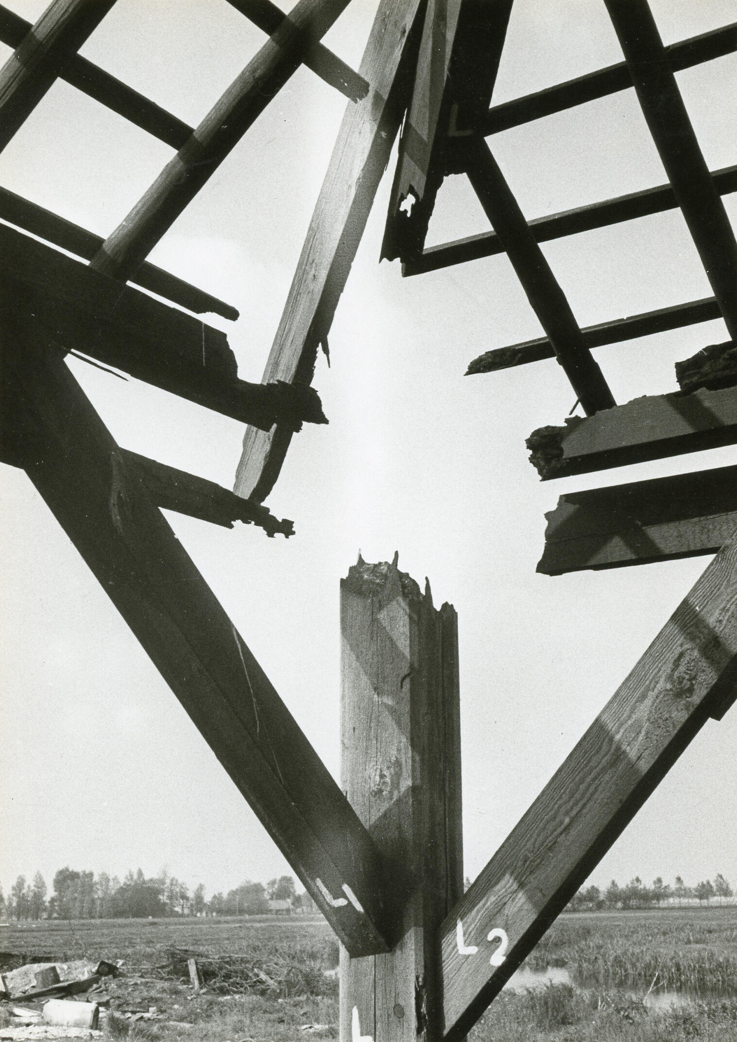 Kap- en gebintconstructie van de fecaliënloods in IJlst (Friesland), gefotografeerd tijdens de demontage in 1975. In de loods werden ingezamelde menselijke uitwerpselen vermengd met 'ruigte' (organisch materiaal), waarna het geheel als compost werd verkocht. In december 1885 werd de loods in gebruik genomen. De onderdelen van de loods werden in 1975 overgebracht naar het Nederlands ...