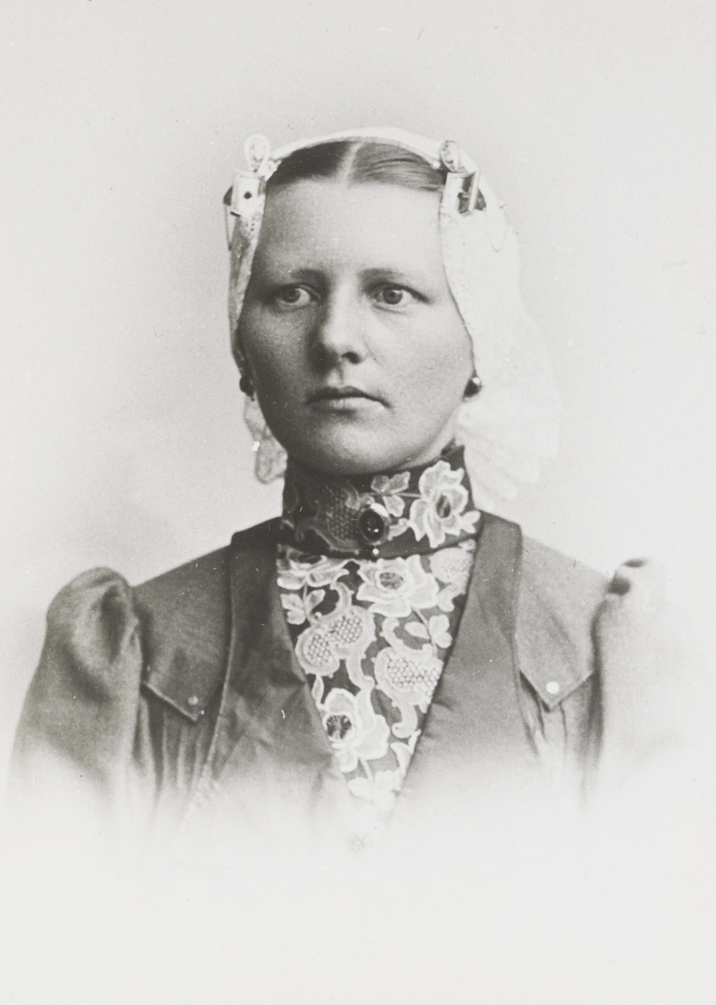 Vrouw in streekdracht van West-Friesland, circa 1900 (zwart-wit foto)