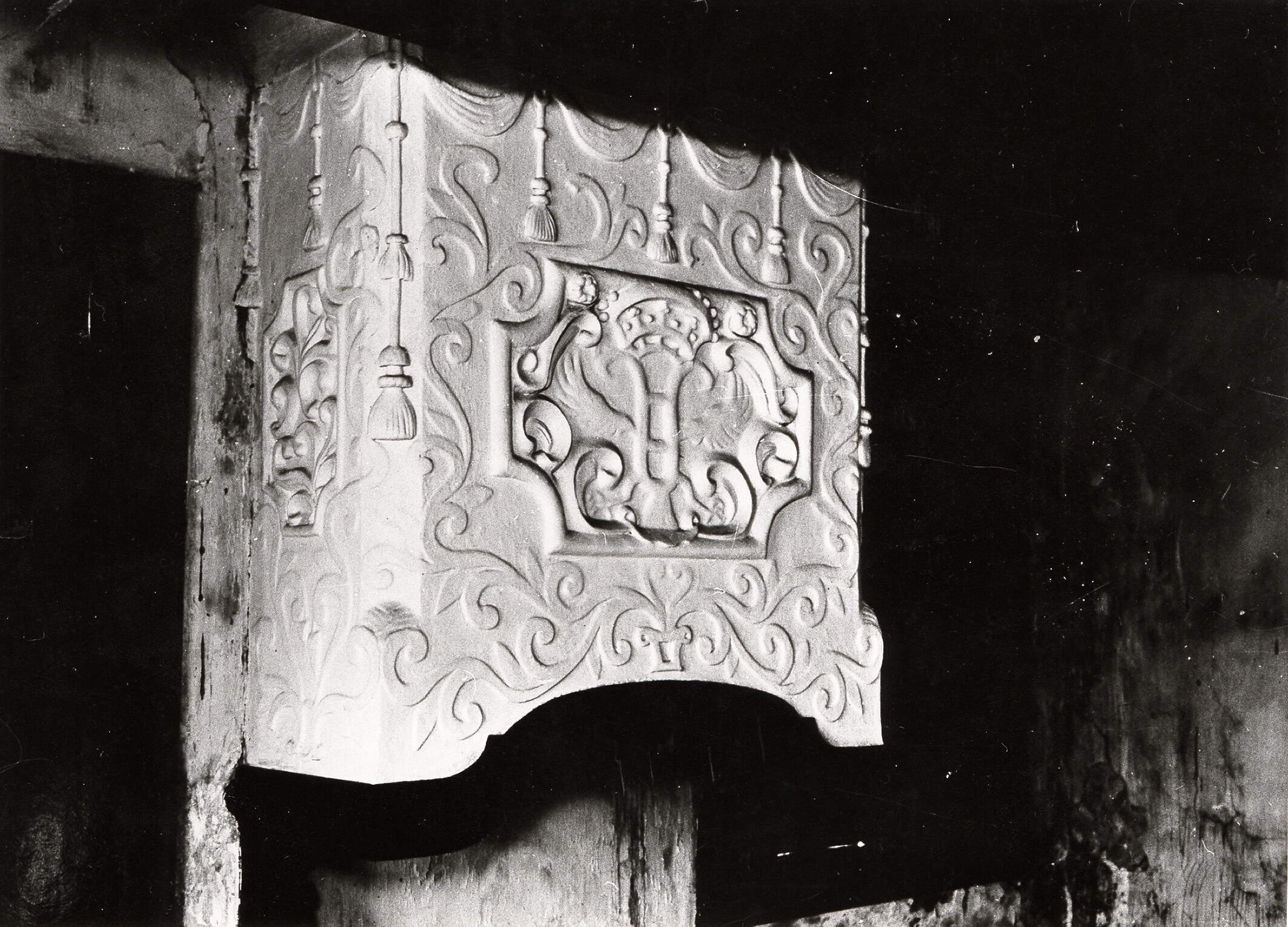Een schouw of schoorsteenboezem, versierd met stucwerk, in een boerderij aan de Hamdijk 12 in Booneschans. Booneschans is een buurtschap in de gemeente Oldambt, in de provincie Groningen. Het voorhuis van de boerderij werd in 1942 door het Nederlands Openluchtmuseum verworven, afgebroken en overgebracht naar het museumterrein in Arnhem. De bouwmaterialen zijn vervolgens verloren gegaan ...