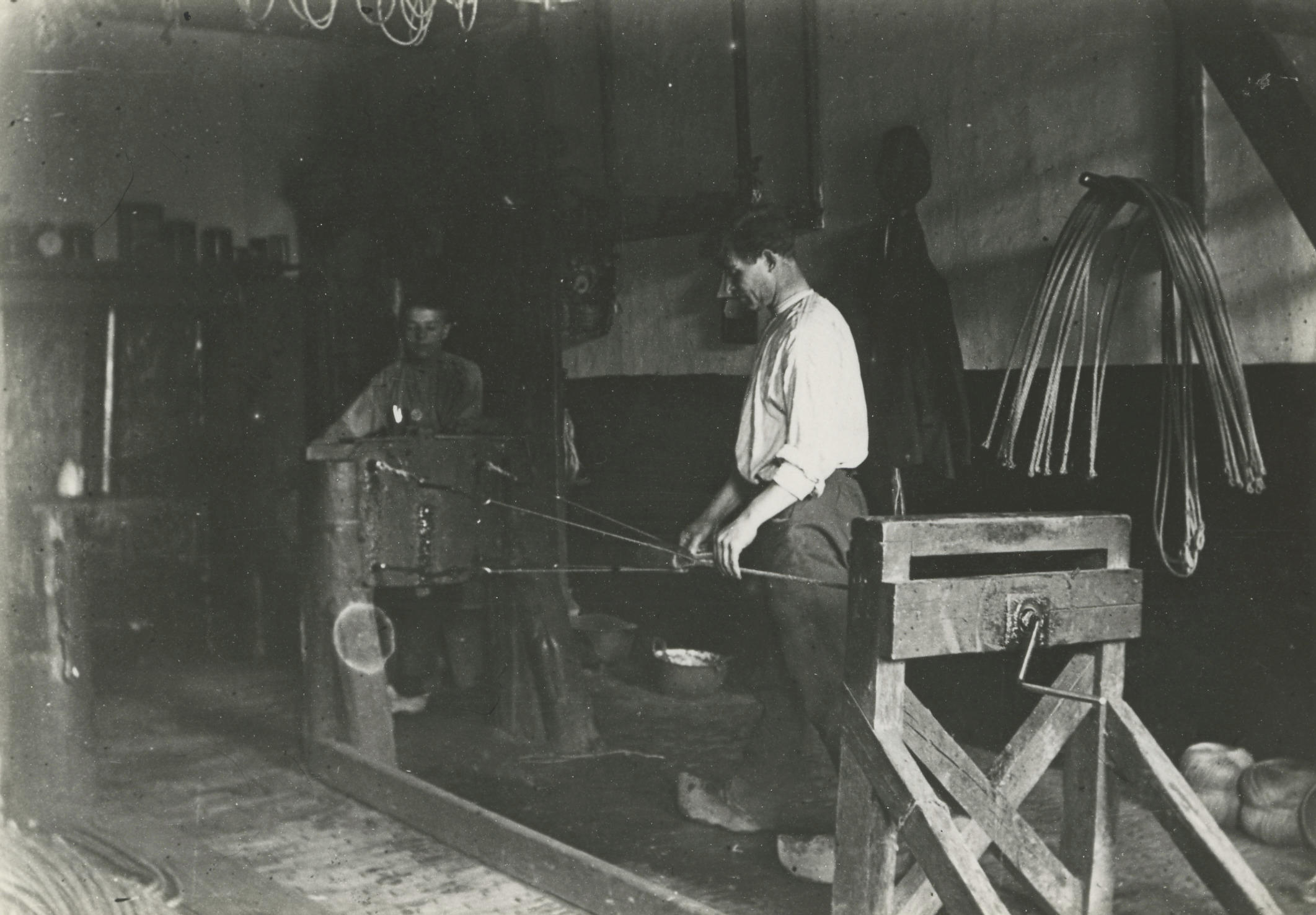 Het maken van korte touwen bij de touwslagerij van Ruger in Soest. Dergelijke korte, dikke touwen worden gebruikt als koetouwen. De leerjongen (links) draait de zogenoemde wapper. Ruger (rechts) hanteert de 'tol'. De tol is voorzien van een steel. Rechts op de voorgrond staat de slee. Tijdens het twijnen, waardoor de drie strengen steeds korter ...