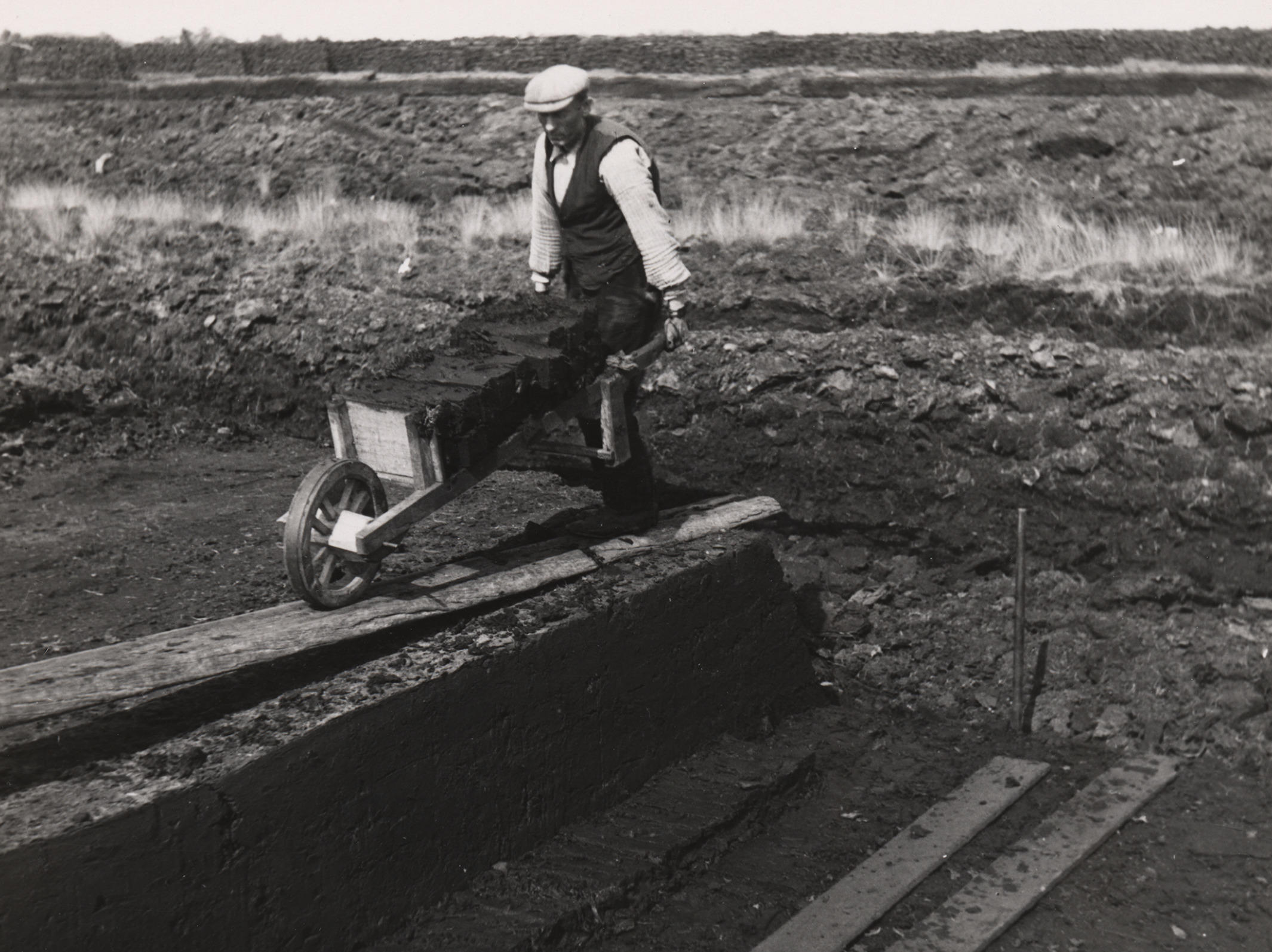 Man met een kruiwagen vol vers gestoken turven, op een vervening bij Nieuw-Schoonebeek.