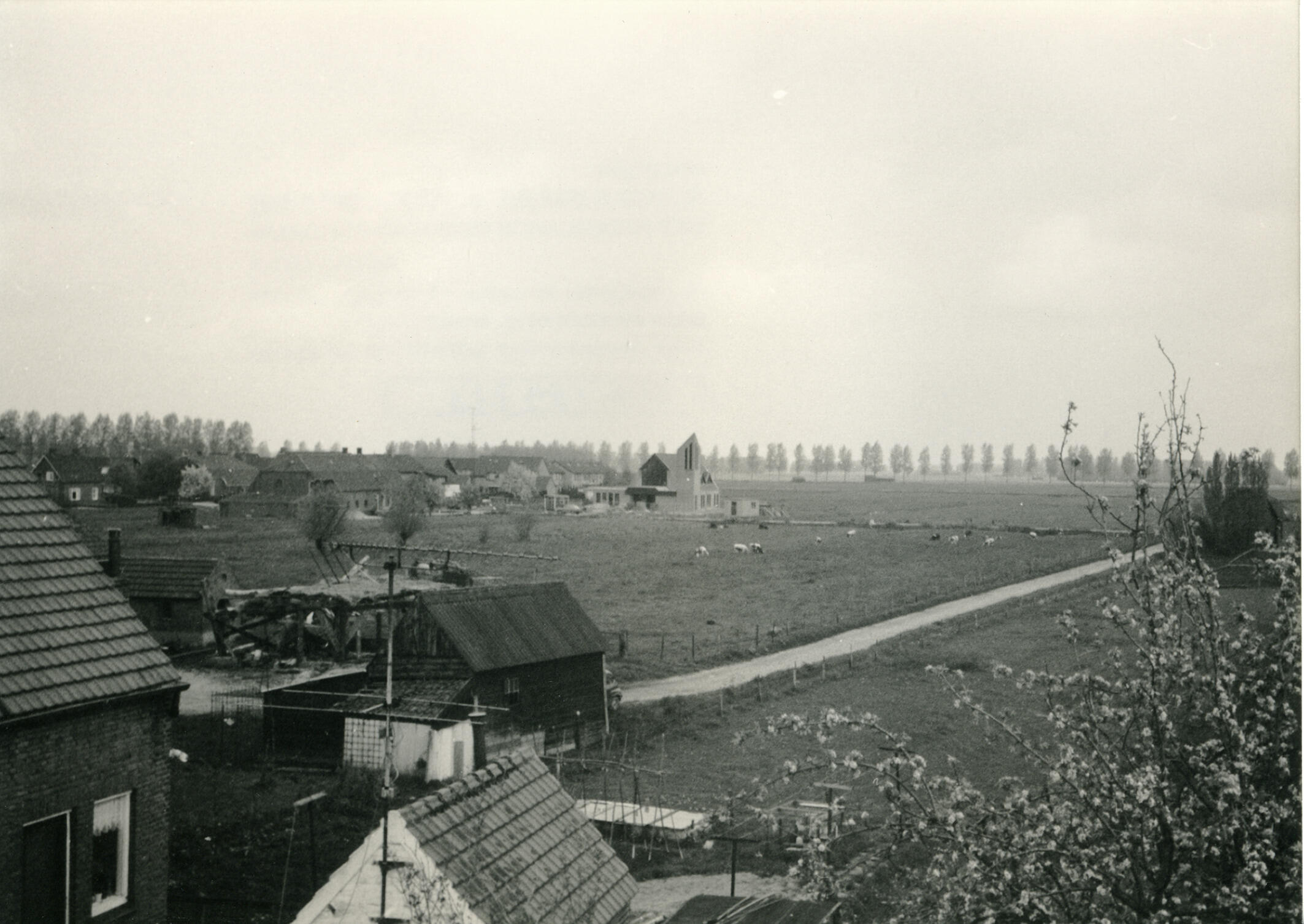 Gezicht op Hellouw, bij Haaften in de Betuwe. De foto is genomen vanaf de Waalbandijk. In de verte staat de Nederlandse hervormde kerk, die in 1983 in gebruik werd genomen als vervanger van de oude kerk uit 1823.