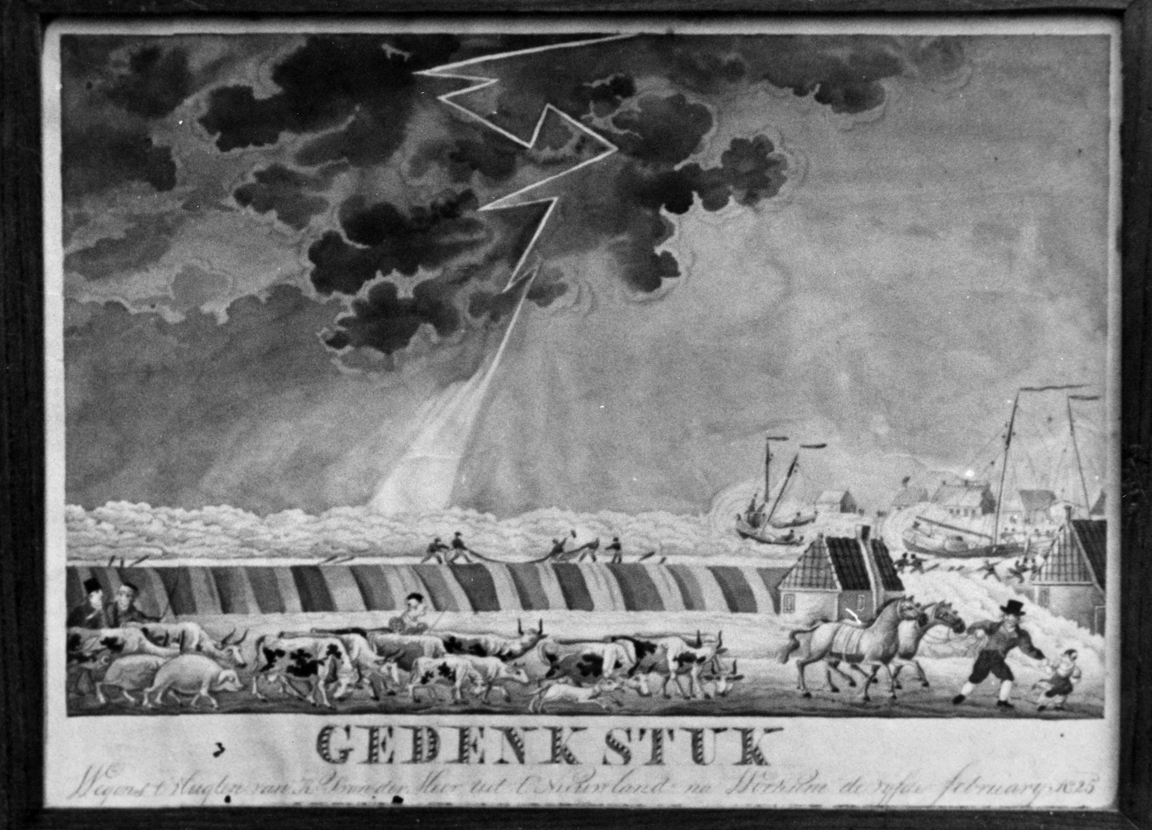 Voorstelling met het onderschrift: 'Gedenkstuk wegens 't vlugten van K.S. van der Meer uit 't Nieuwland na Workum, de vijfden february 1825'. De voorstelling is onderdeel van een serie van vijf platen, met daarop de verschrikkingen van de Watersnoodramp van 1825. De plaat is eigendom van een familie in Workum.