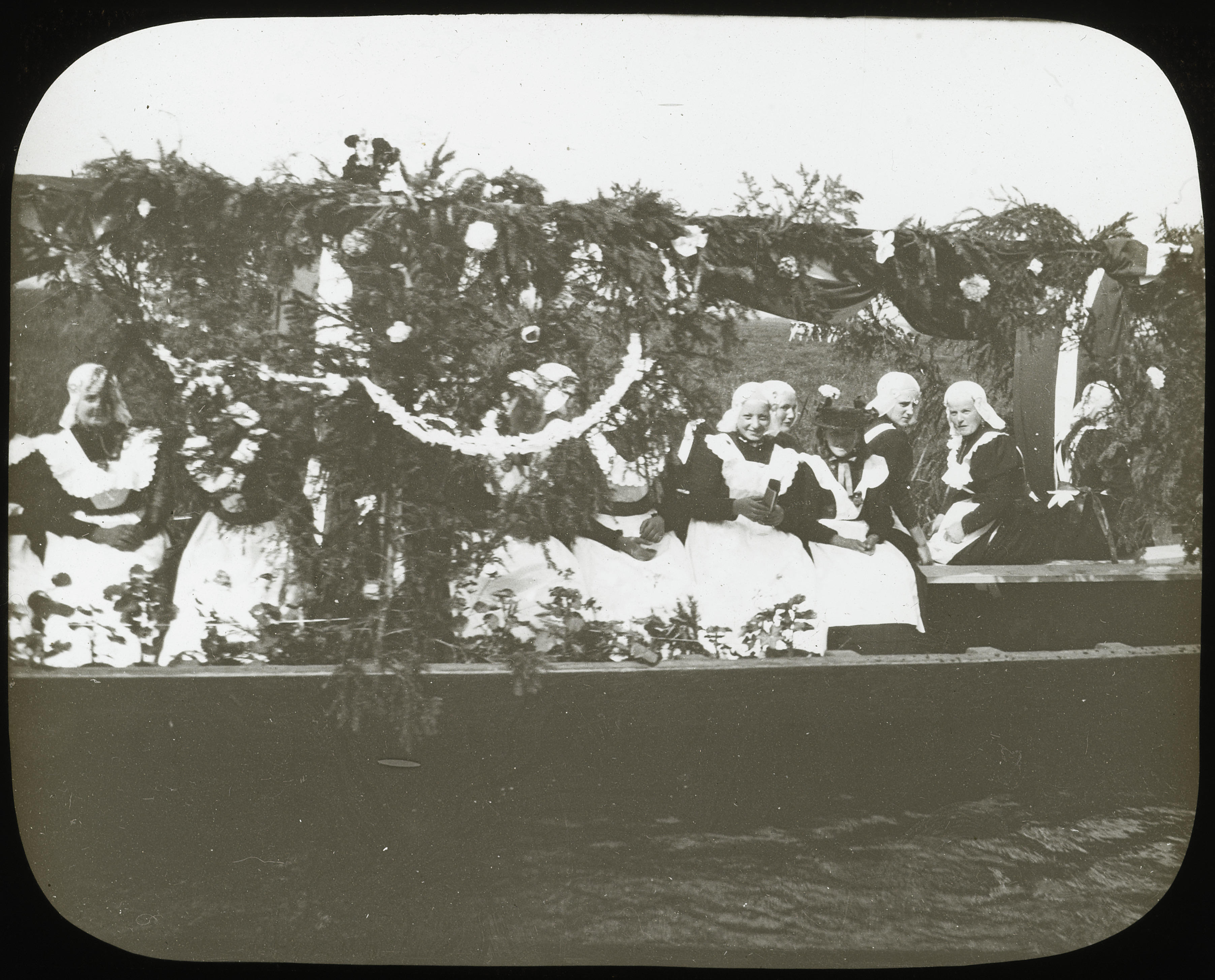 Vrouwen en meisjes in streekdracht op een versierde boot, tijdens een volksfeest in Giethoorn. De opname is waarschijnlijk gemaakt omstreeks 1900.