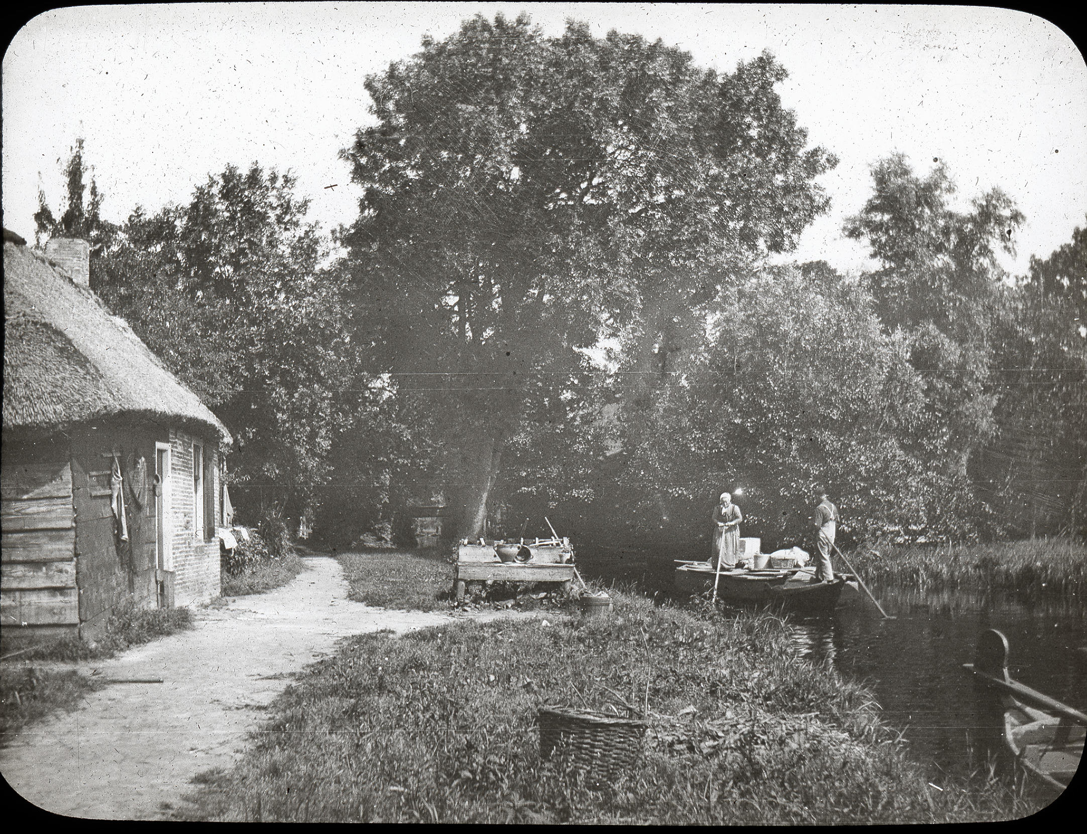 Dorpsgezicht in Giethoorn. Links staat een rietgedekte boerderij met deels houten wanden. Rechts zijn een vrouw en man op een punter te zien. De vrouw is gekleed in Gieterse streekdracht. Aan de waterkant staat een 'schöttelbaank'. De opname is waarschijnlijk gemaakt omstreeks 1900.